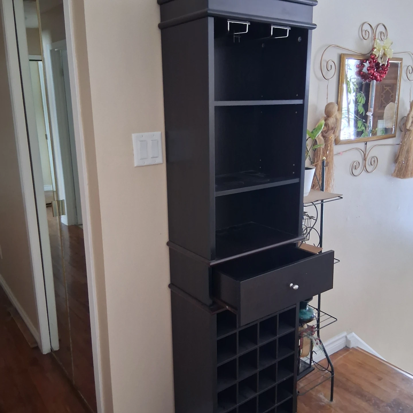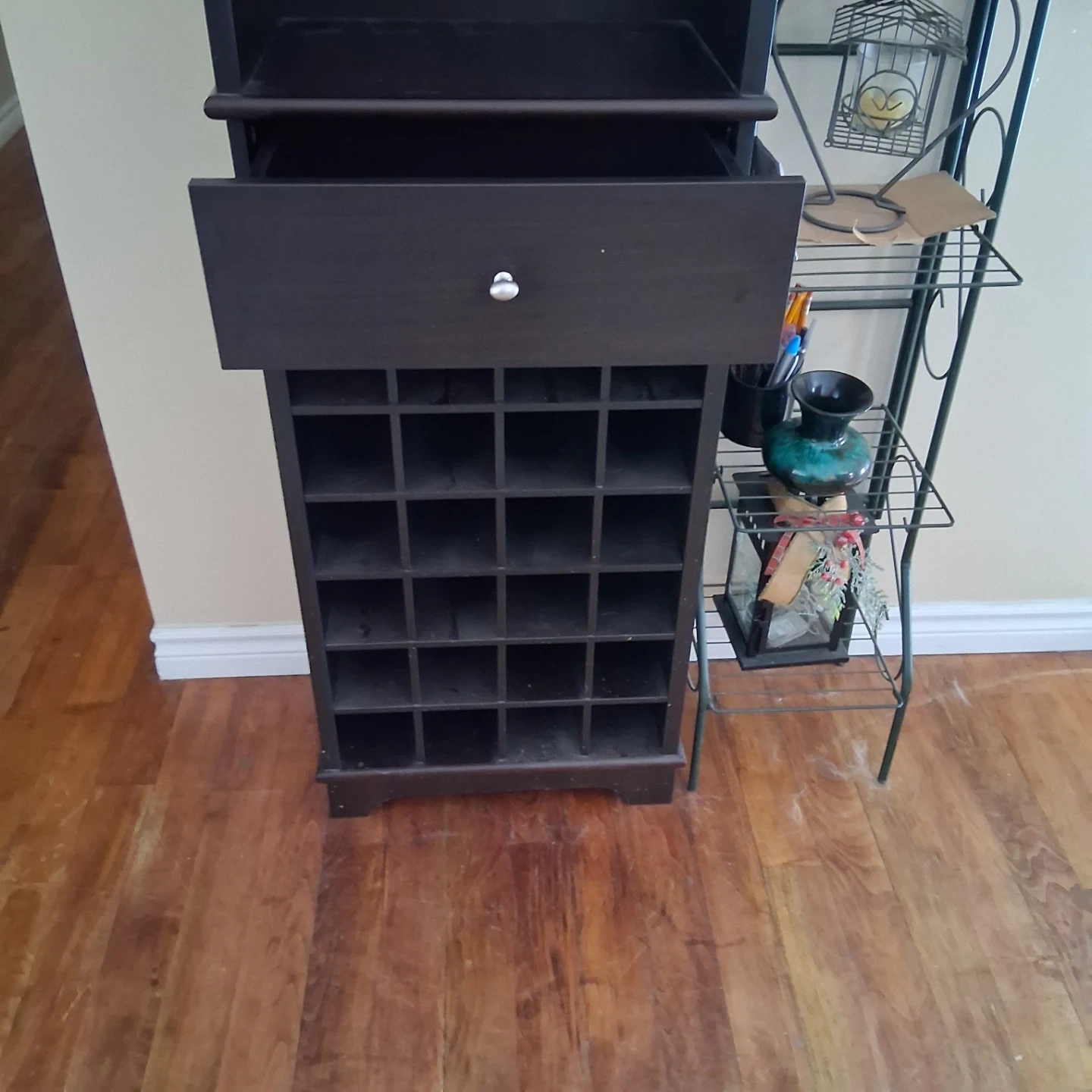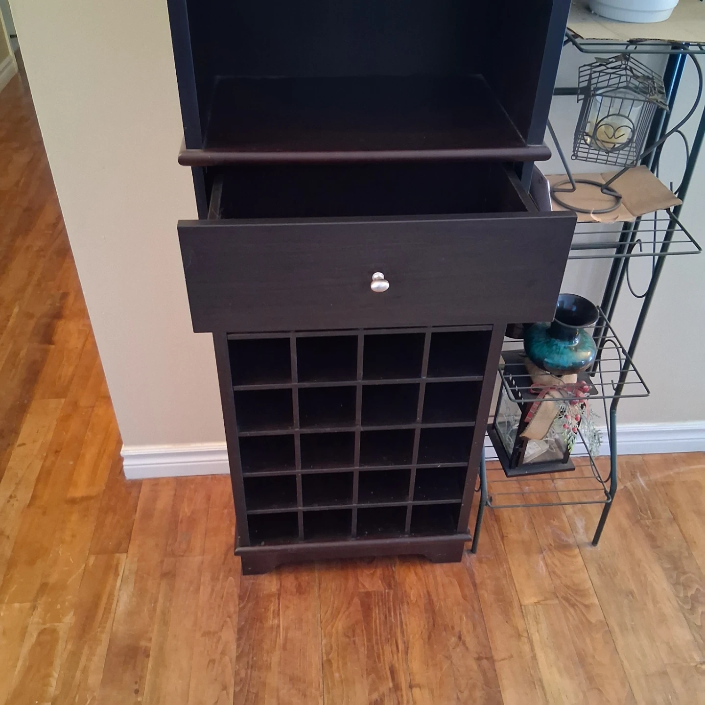 Selling a dark brown wine rack cabinet. It features a drawer, shelving, and storage for wine bottles. Great for organizing your wine and bar accessories!
