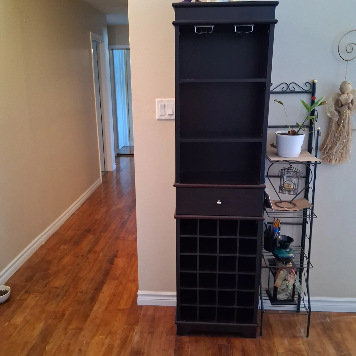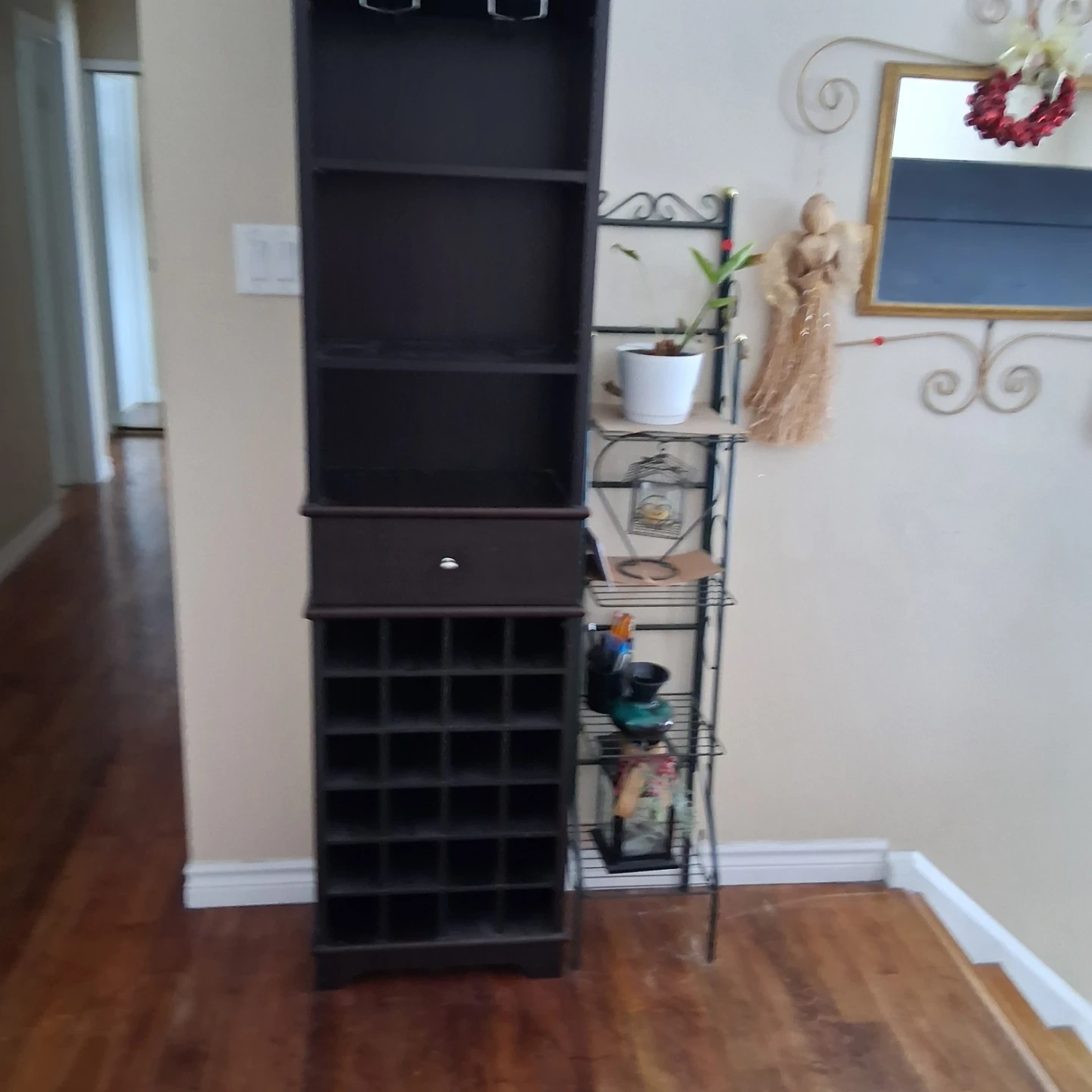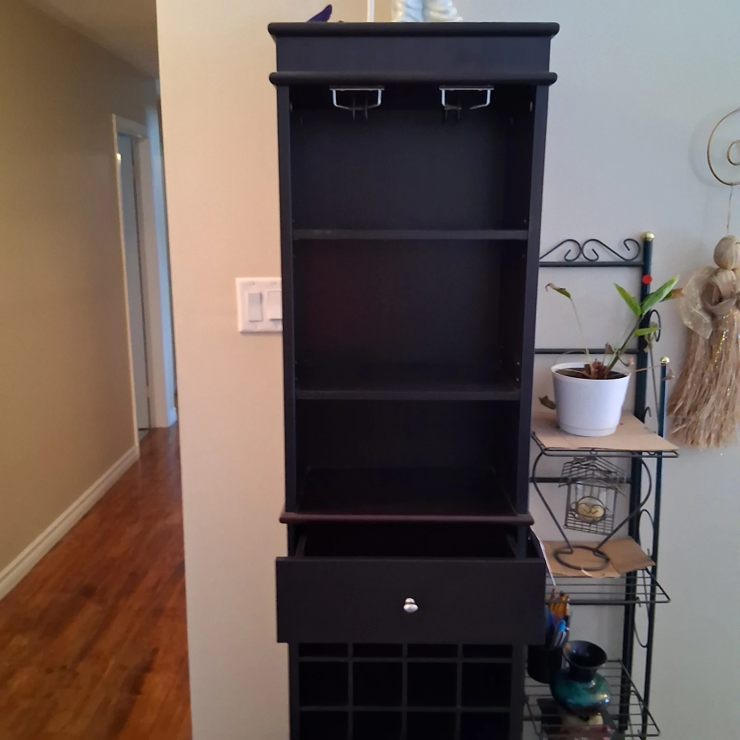 Selling a dark brown wine rack cabinet. It features a drawer, shelving, and storage for wine bottles. Great for organizing your wine and bar accessories!