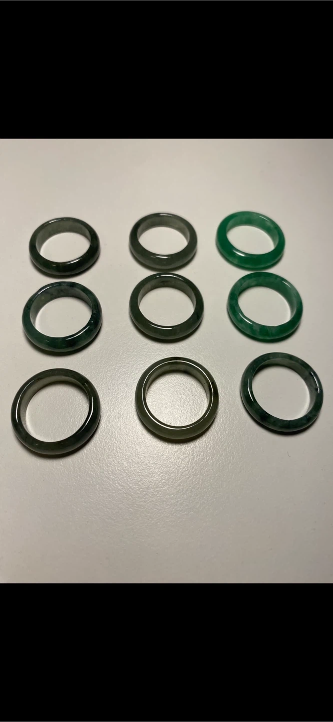 Selling a collection of jade rings in various shades of green. These rings are simple and elegant, perfect for everyday wear or as a thoughtful gift. They appear to be in good condition and ready to be enjoyed!