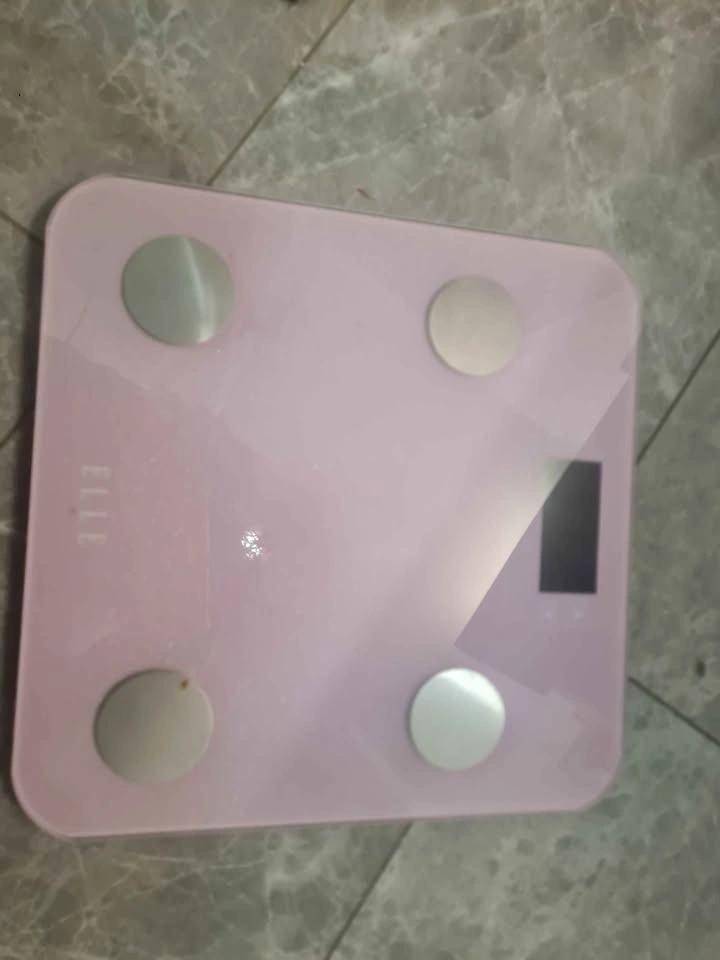 Pink digital scale with four sensors and a small LCD display. Has a flat surface and is battery operated. The back has a battery compartment and non-slip feet.