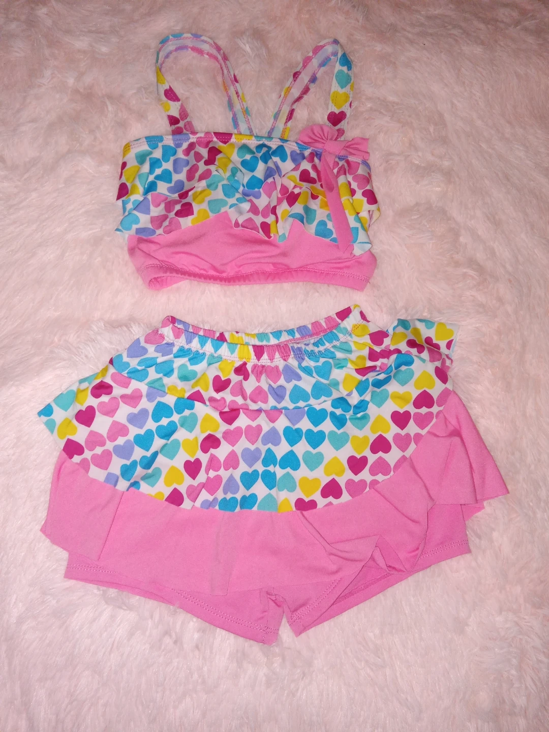Super cute girls' swimsuit set with a colourful heart pattern on the top and skirt! The set is in great condition and perfect for summer fun at the beach or pool