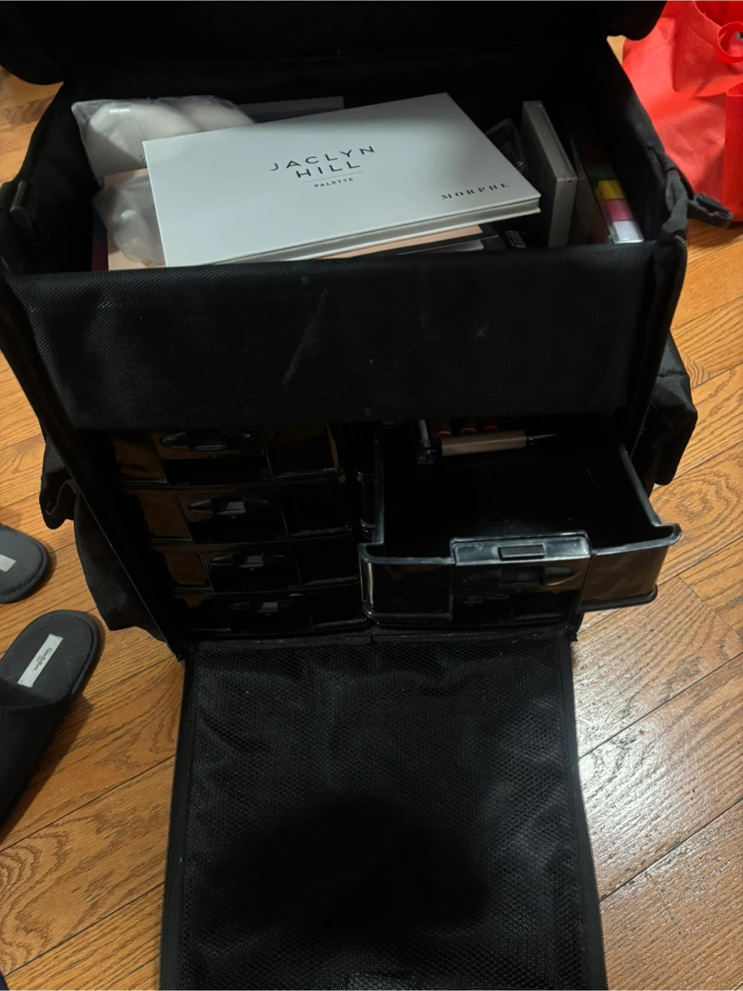 Selling a rolling train case, perfect for makeup artists or anyone needing a portable storage solution! It's black and has multiple compartments and drawers to keep everything organized