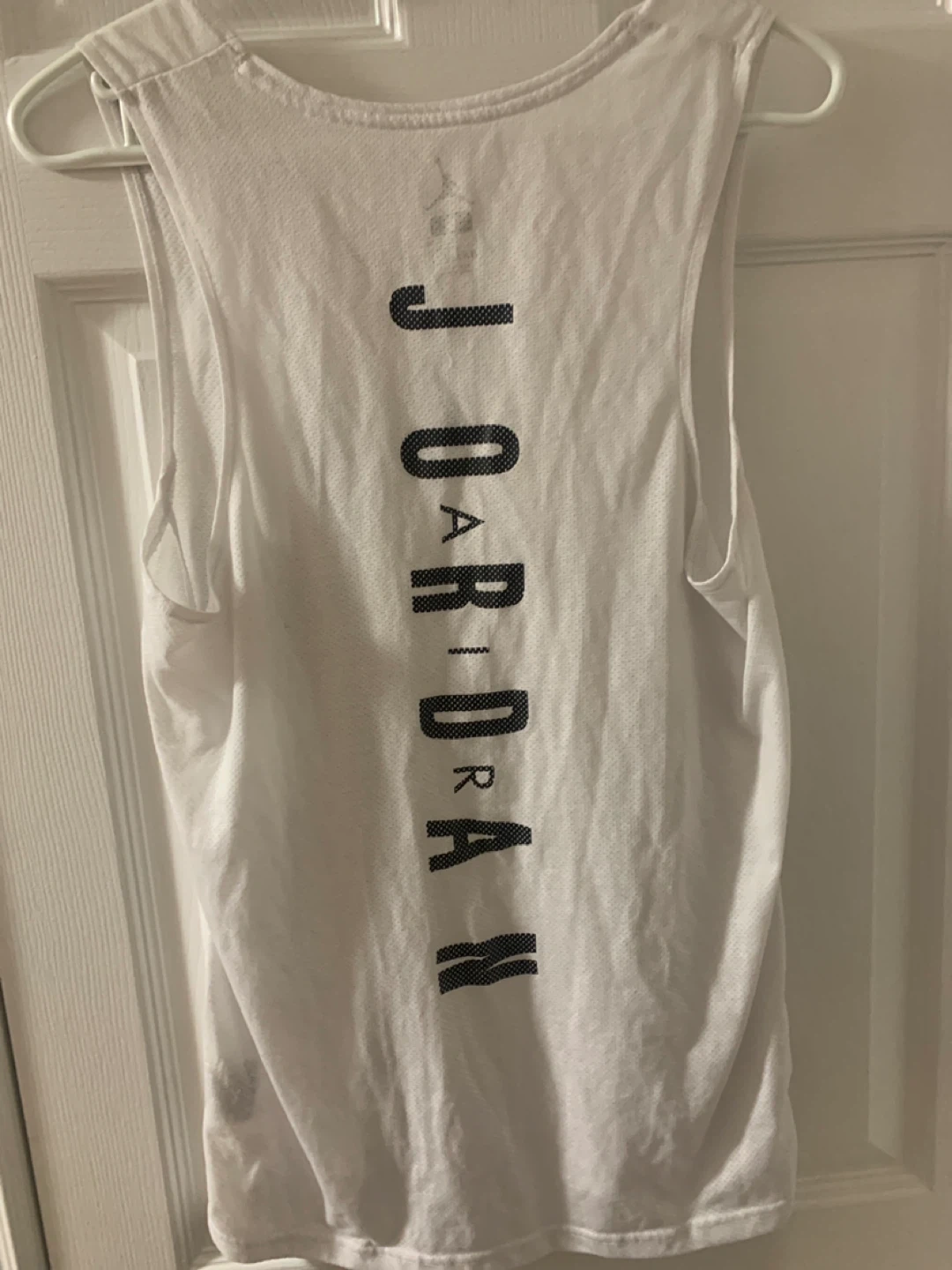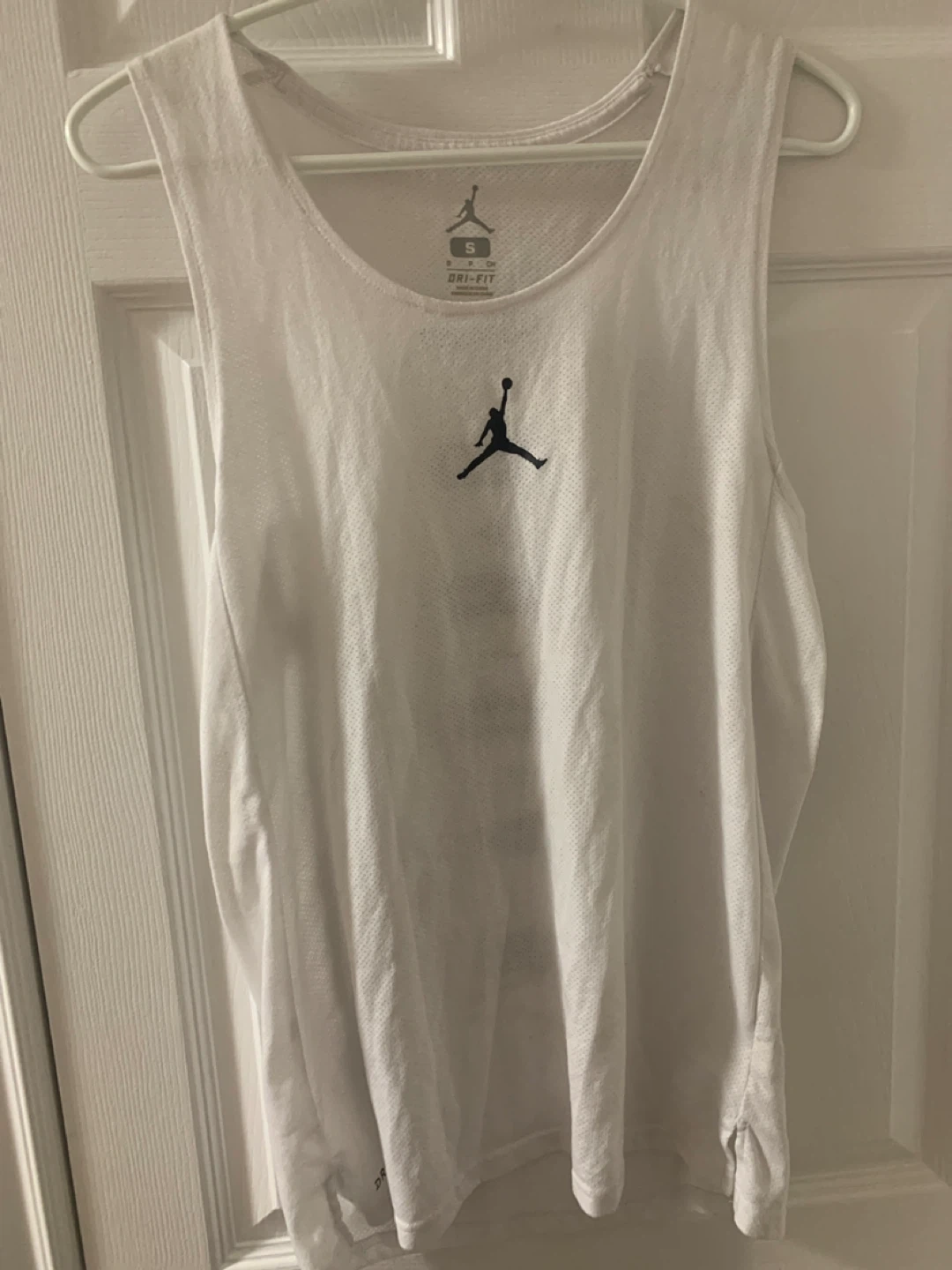 Selling a Jordan Dri-FIT white tank top in size small. Great for workouts or casual wear! It features the iconic Jumpman logo on the front and the Jordan name vertically down the back. The fabric is breathable and comfortable.