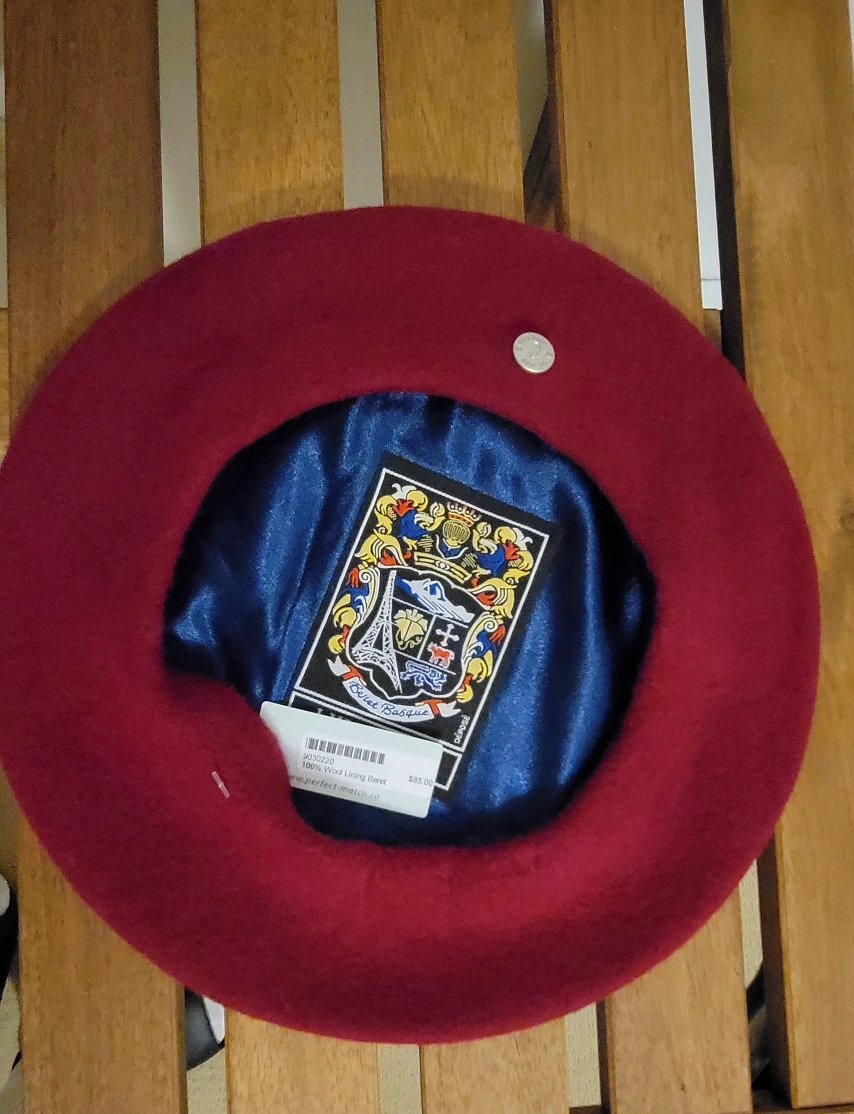 This stylish beret is a Perfect Match! It's made of 100% wool lining and comes in a lovely burgundy color. It's in perfect condition and ready to add a touch of flair to your wardrobe.
