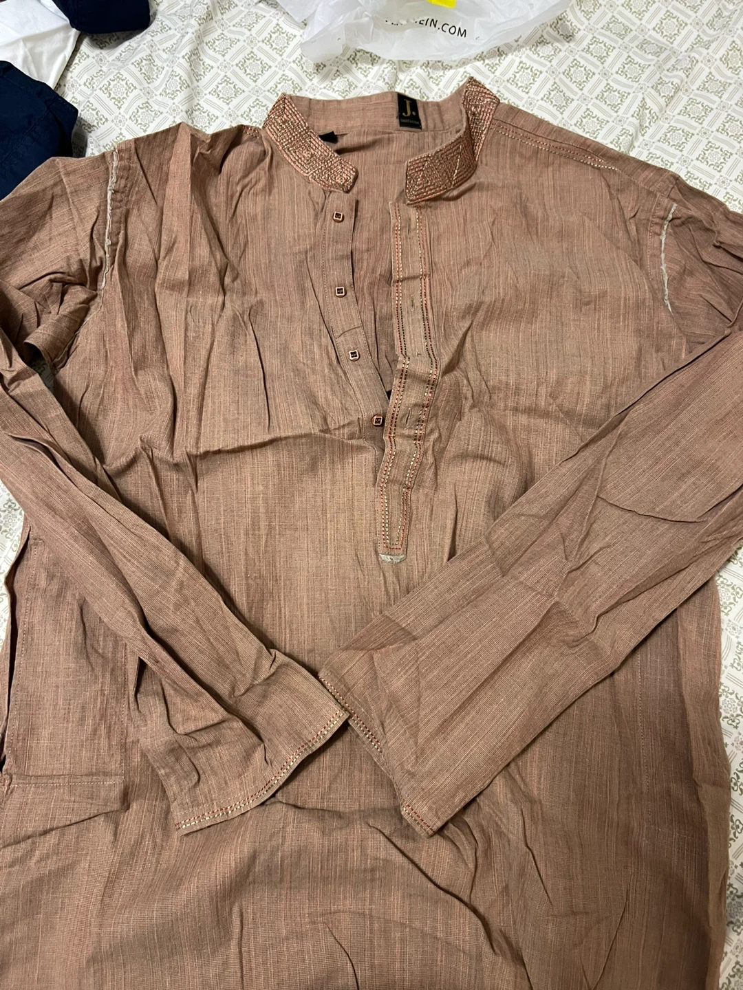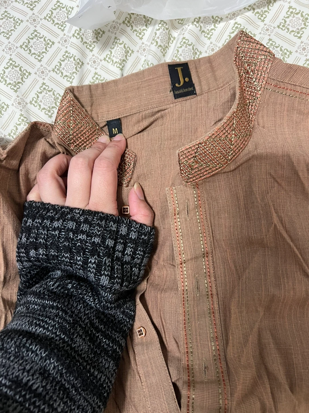 Selling a J. Junaid Jamshed kurta in size medium. It's a stylish piece with intricate detailing around the collar and placket. The colour is a nice earthy brown. Perfect for casual wear or special occasions!