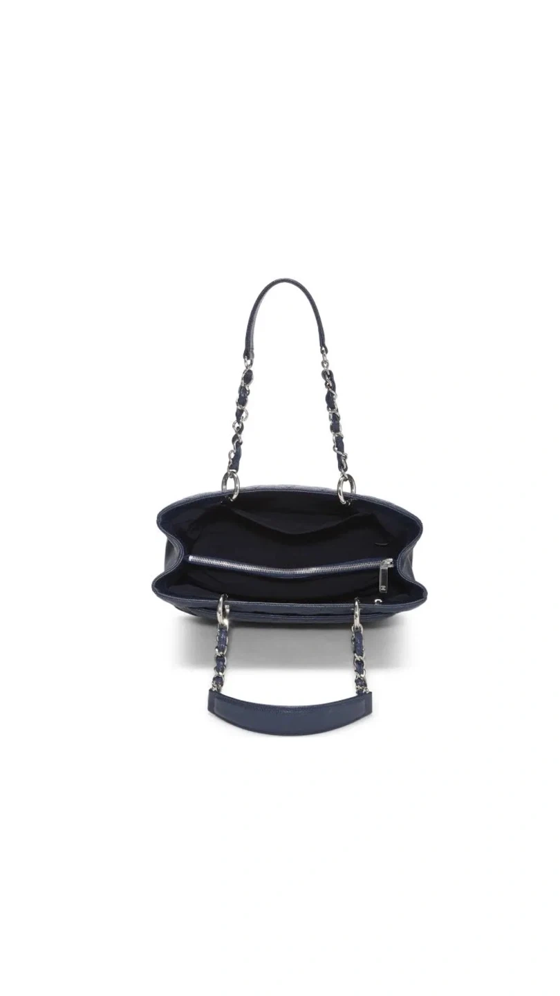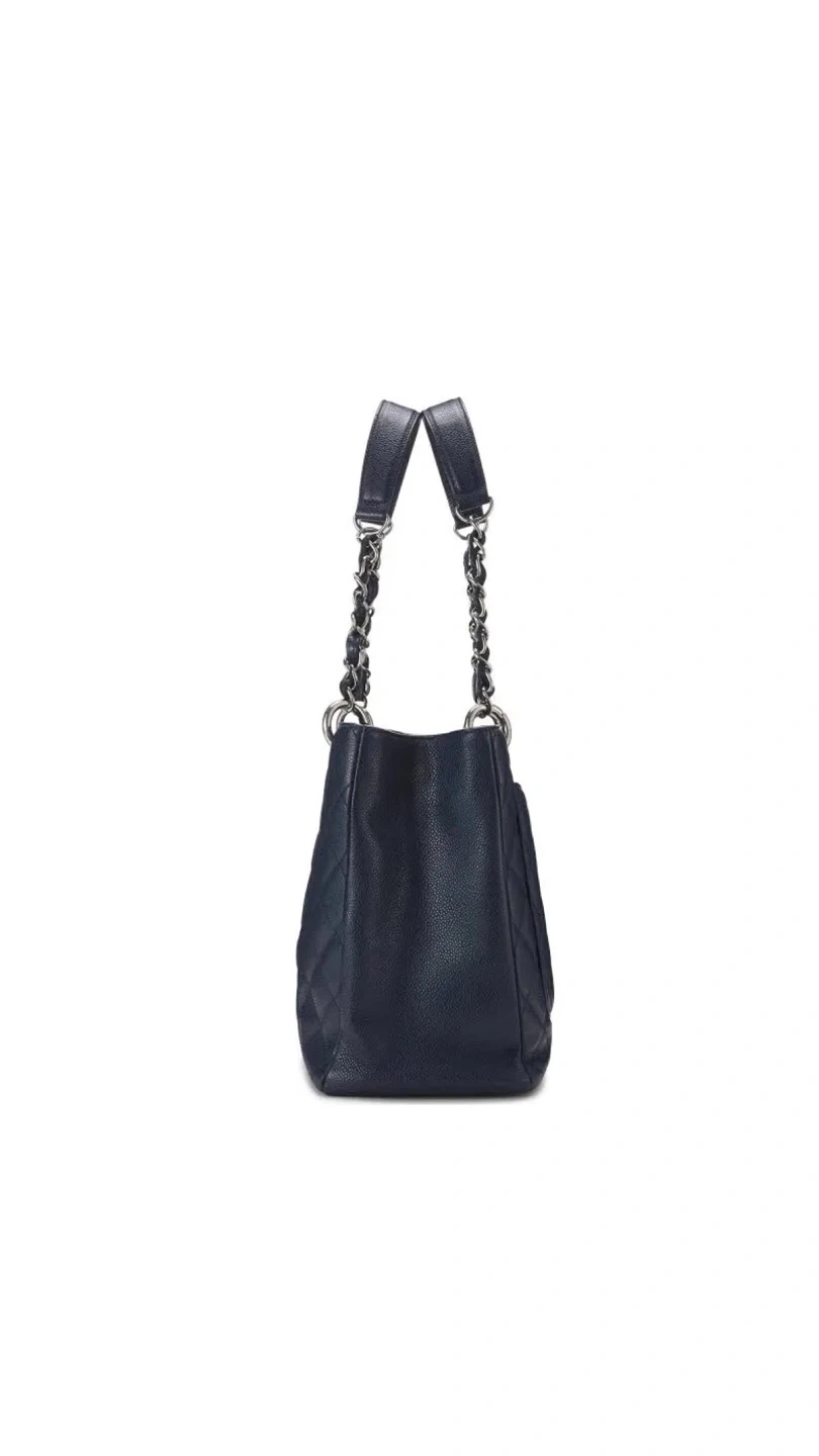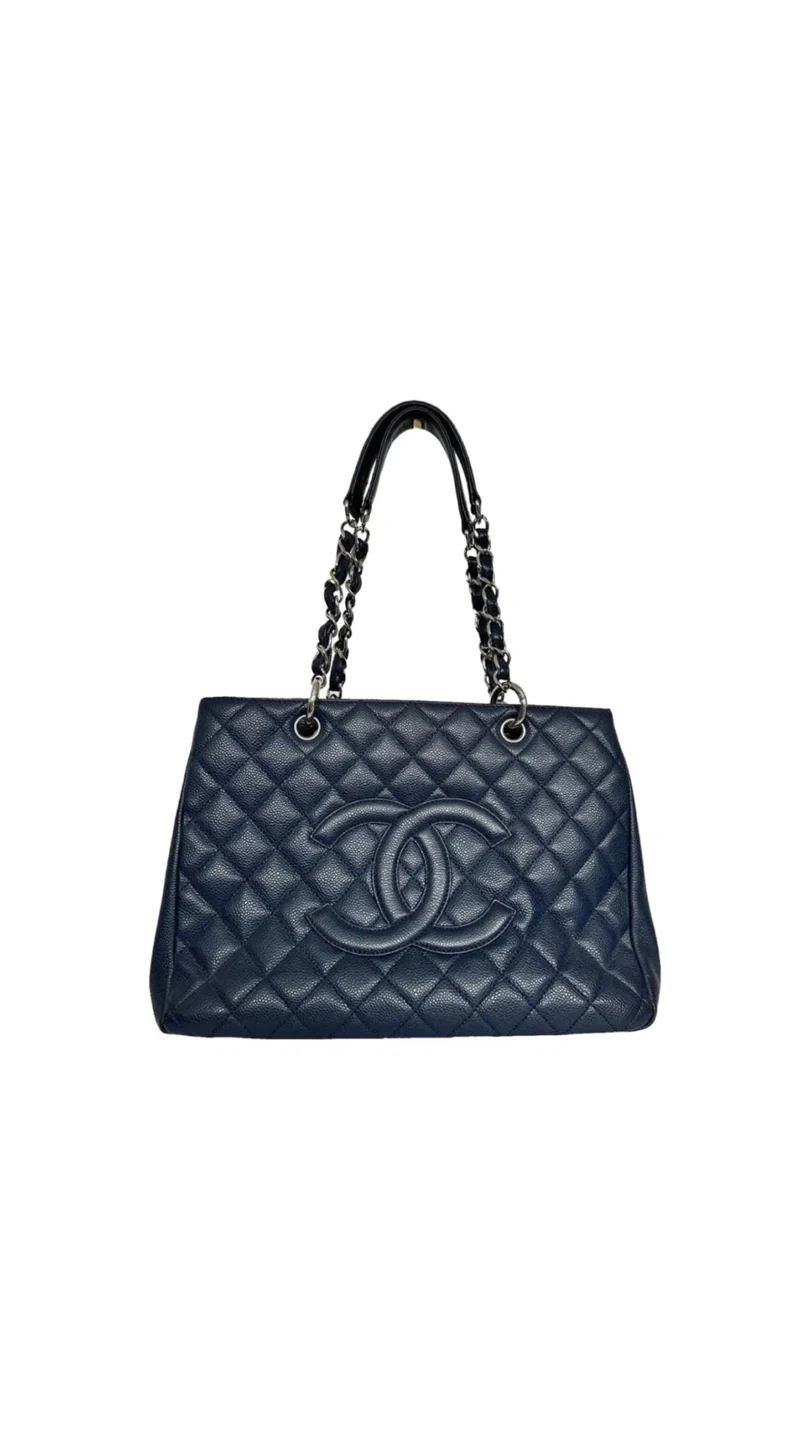 Authentic Chanel caviar leather tote bag. Interior silk lining & silver tone hardware. Two compartments and a middle zipper pocket. Outside has a slim pocket. Easy to use everyday.