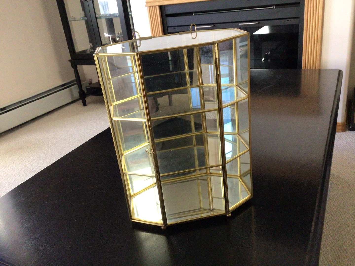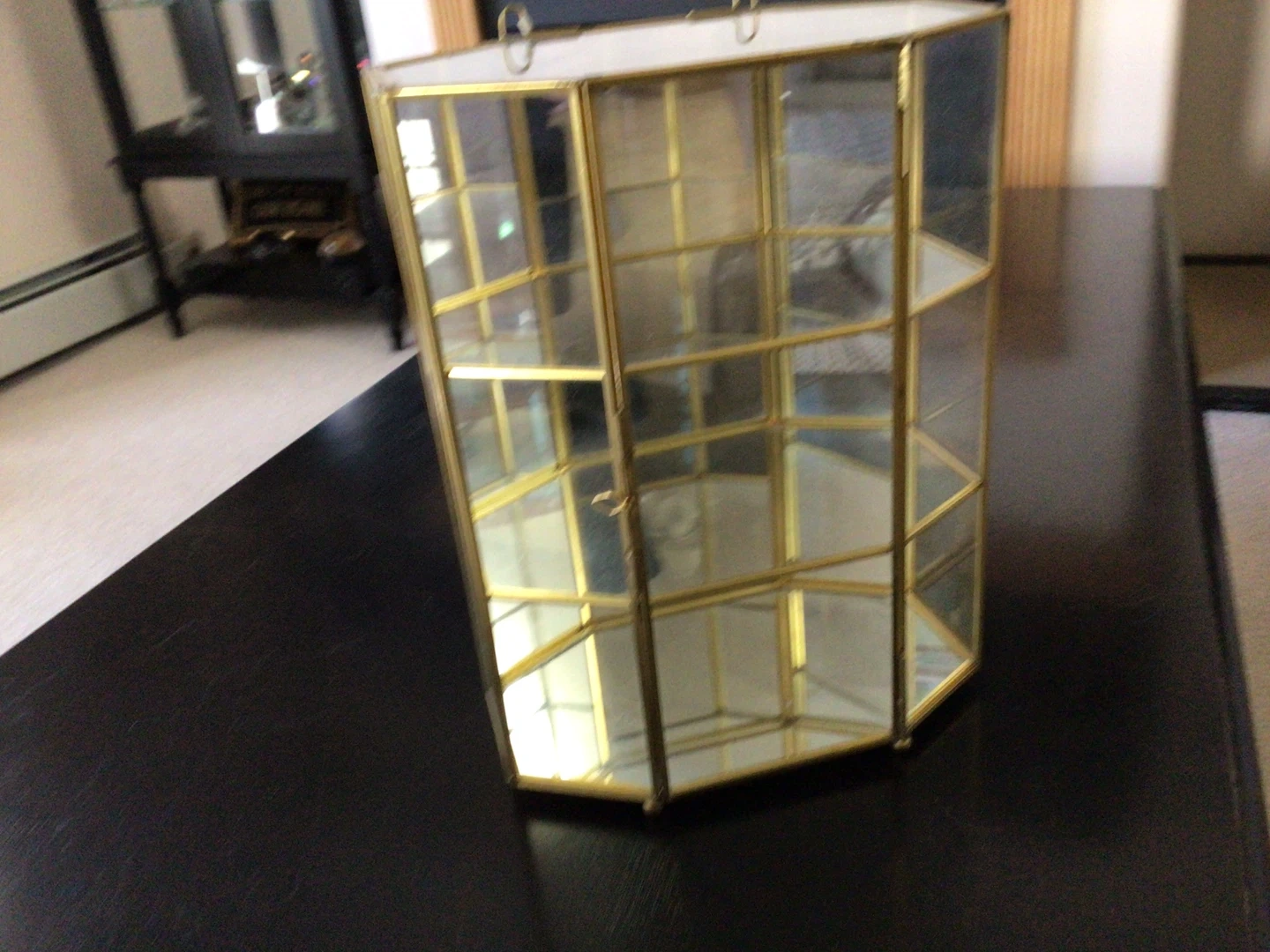 Selling a glass display case with gold trim. It's in great shape and would be perfect for displaying collectibles or other small items. It has a door for easy access and multiple shelves.