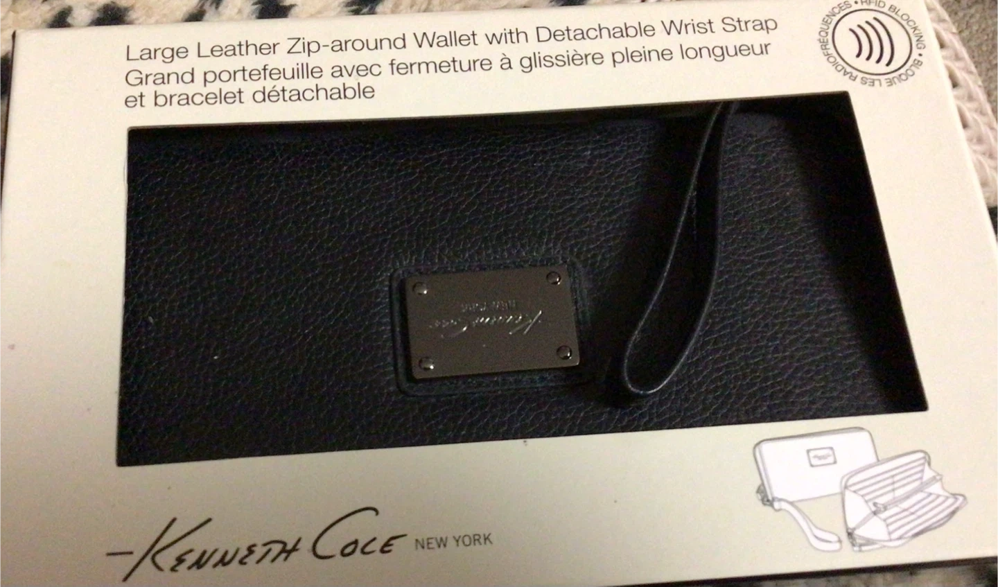 Selling a Kenneth Cole New York large leather zip-around wallet with a detachable wrist strap. It features: