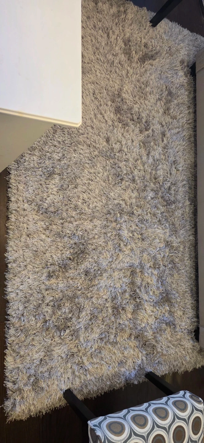 A cozy shaggy area rug in grey, perfect for adding warmth and texture to any room! It's in great condition, barely used, and ready to be picked up