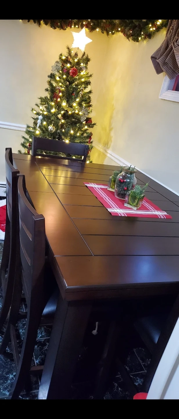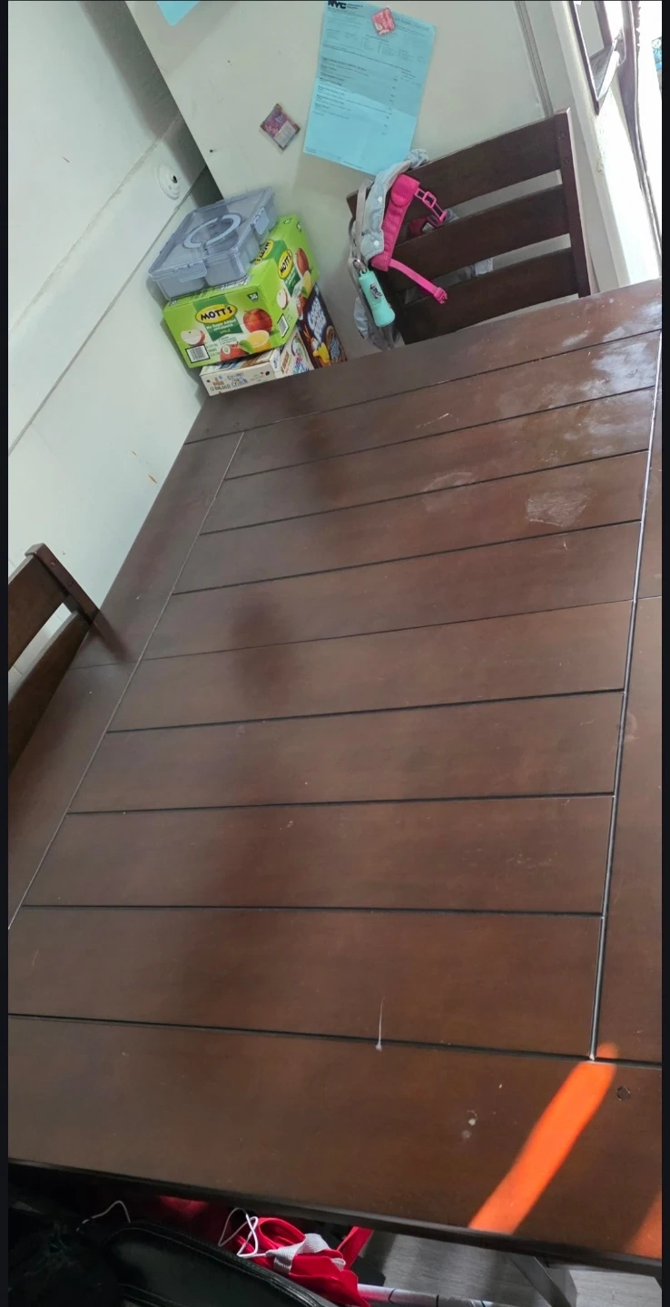 Selling a high rise counter height dining table with chairs. It has a dark brown finish and a classic design. The table is sturdy and in fair condition, perfect for family meals or gatherings. Table is to large for the space. Raymour and Flanigan purchase. Solid wood. Has a white spot can sand down and stain it.