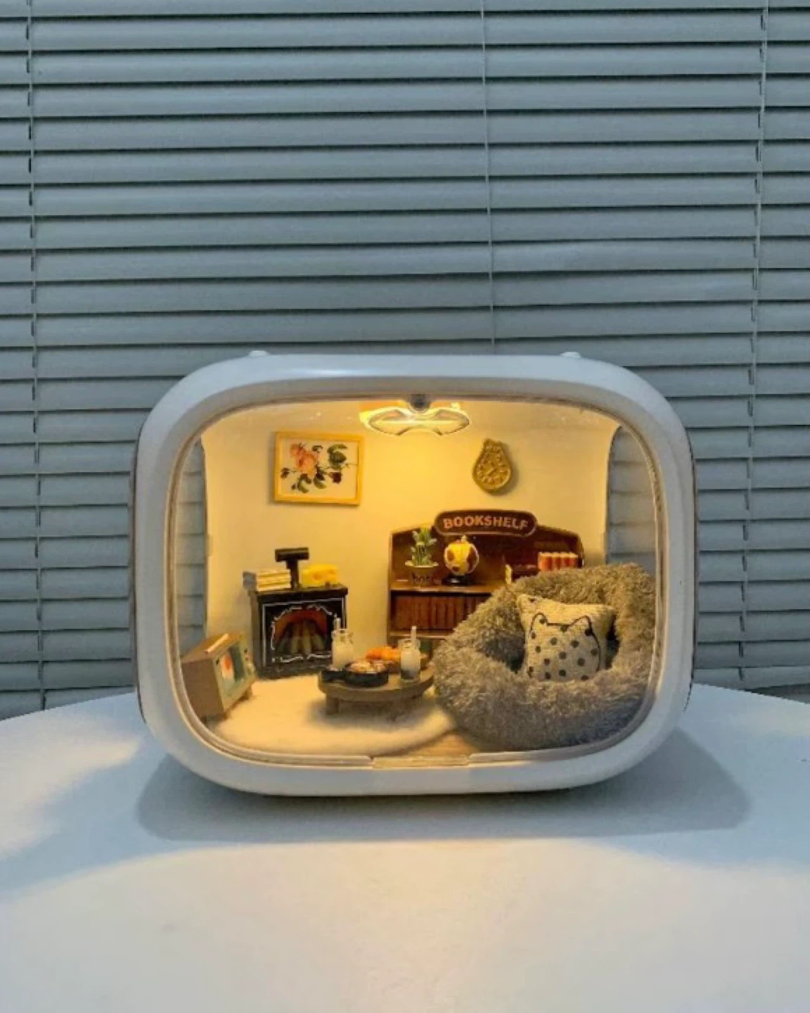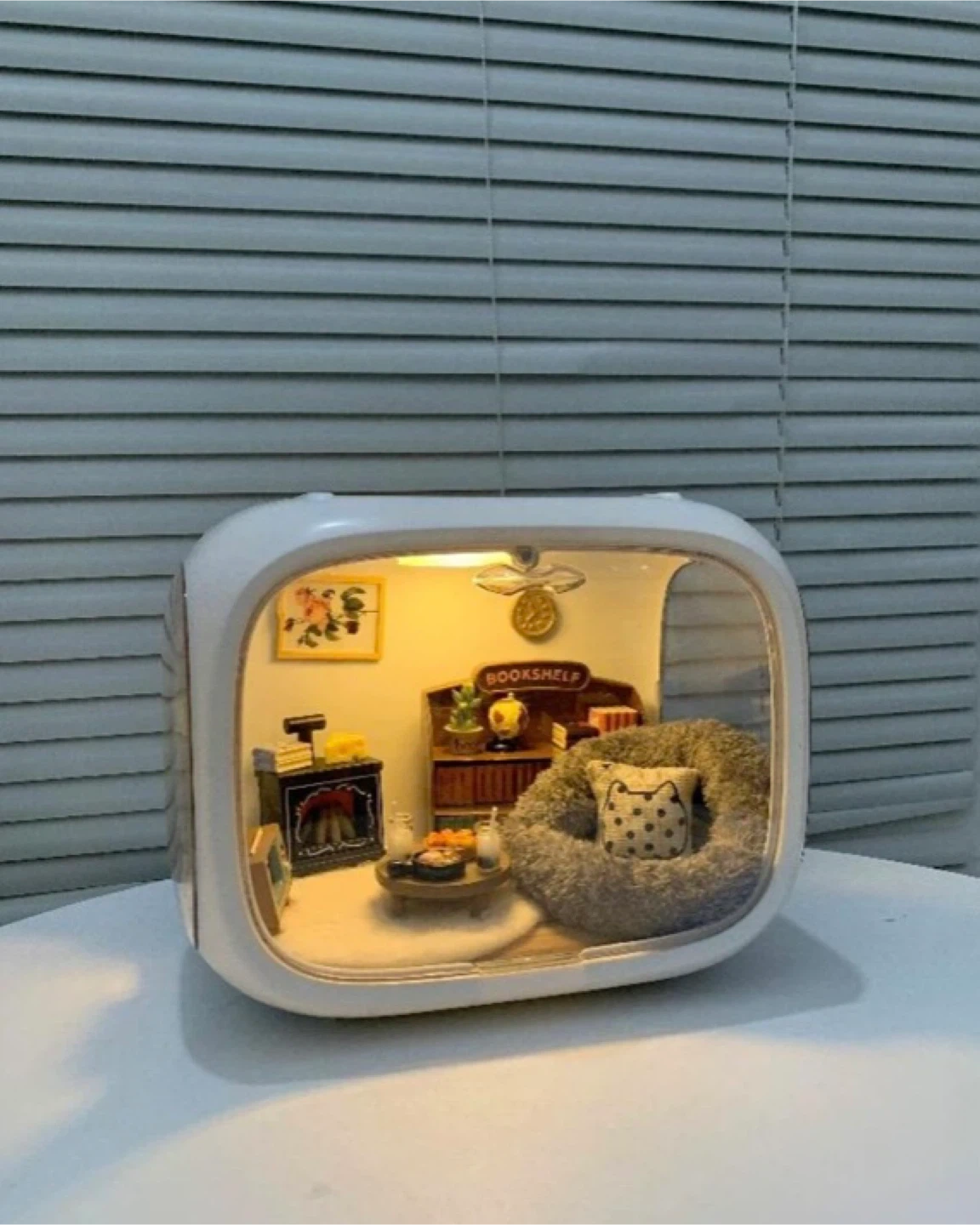 This is a super cute DIY miniature dollhouse kit! It features a cozy bookshelf theme with lots of tiny details like a fireplace, books, and even a little meal setup. It's perfect for anyone who loves miniatures or enjoys crafting. The kit comes in a white, retro-style TV shaped case with a clear cover