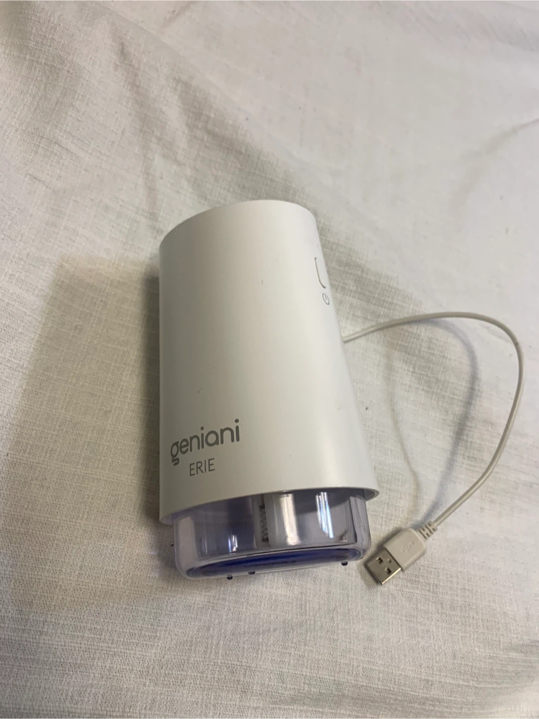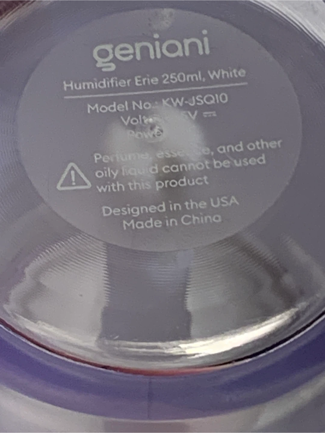 Selling a Geniani Erie humidifier, 250ml capacity, in white. Model number is KW-JSQ10. It comes with a USB cable for power. Designed in the USA and made in China.