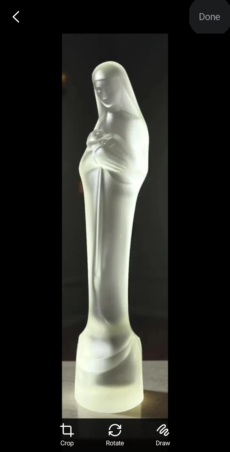 This is an Art Deco frosted glass "Madonna and Child" statue designed by Stef Uiterwaal.