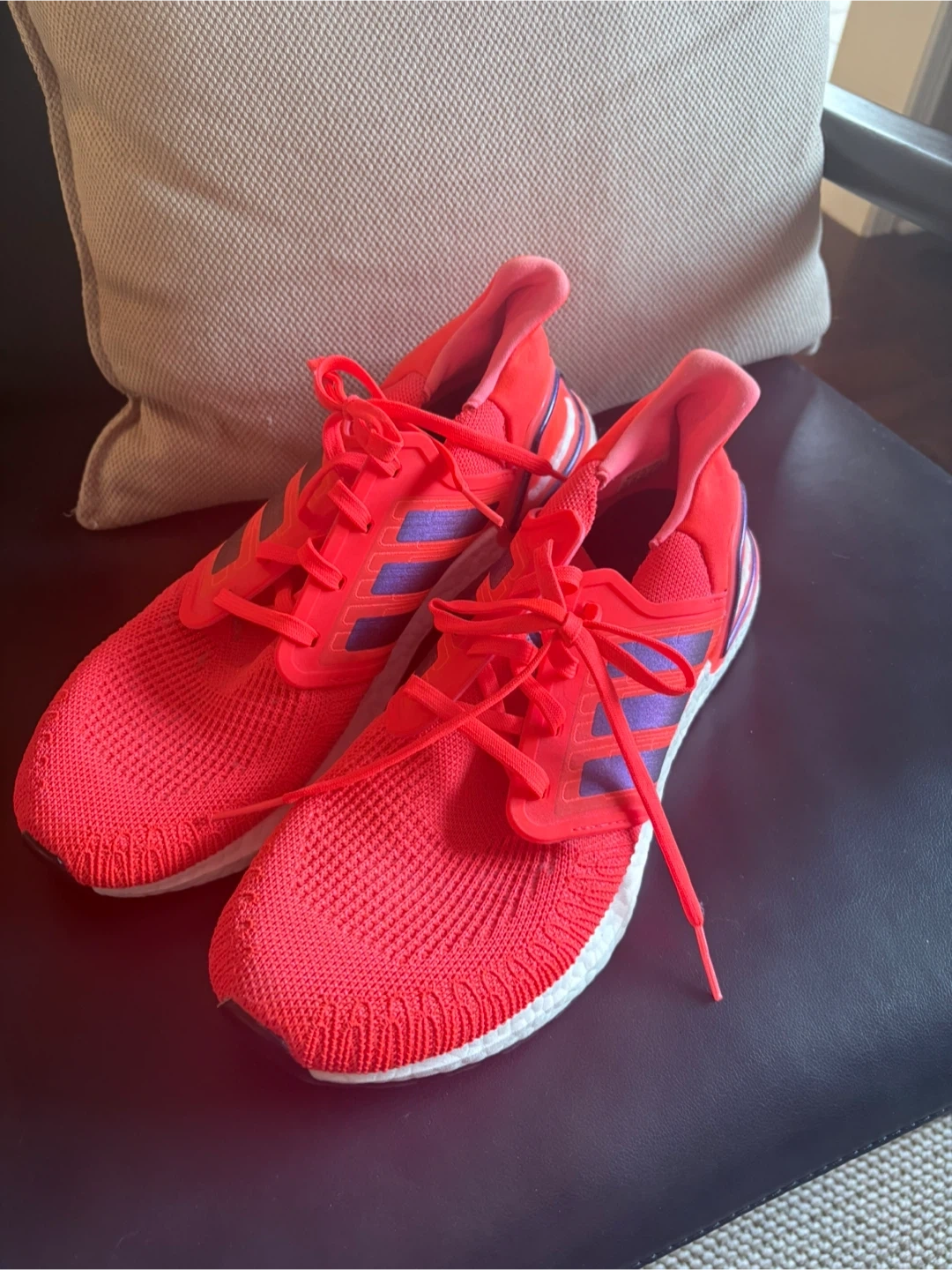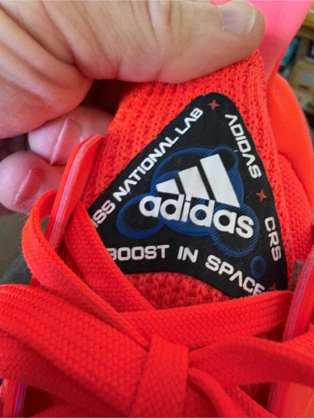 Selling a pair of Adidas Ultraboost 20 ISS National Lab running shoes in US size 10.5. These are in a vibrant orange colour. They feature the Boost midsole for comfortable cushioning. Great for running or casual wear!