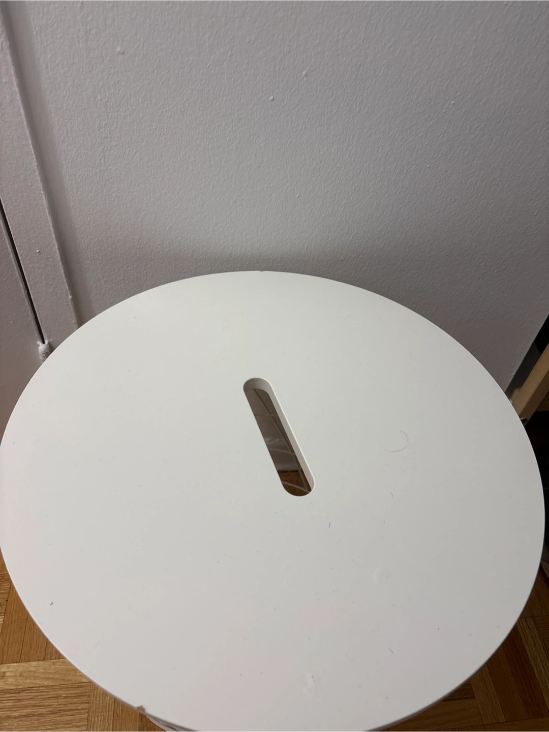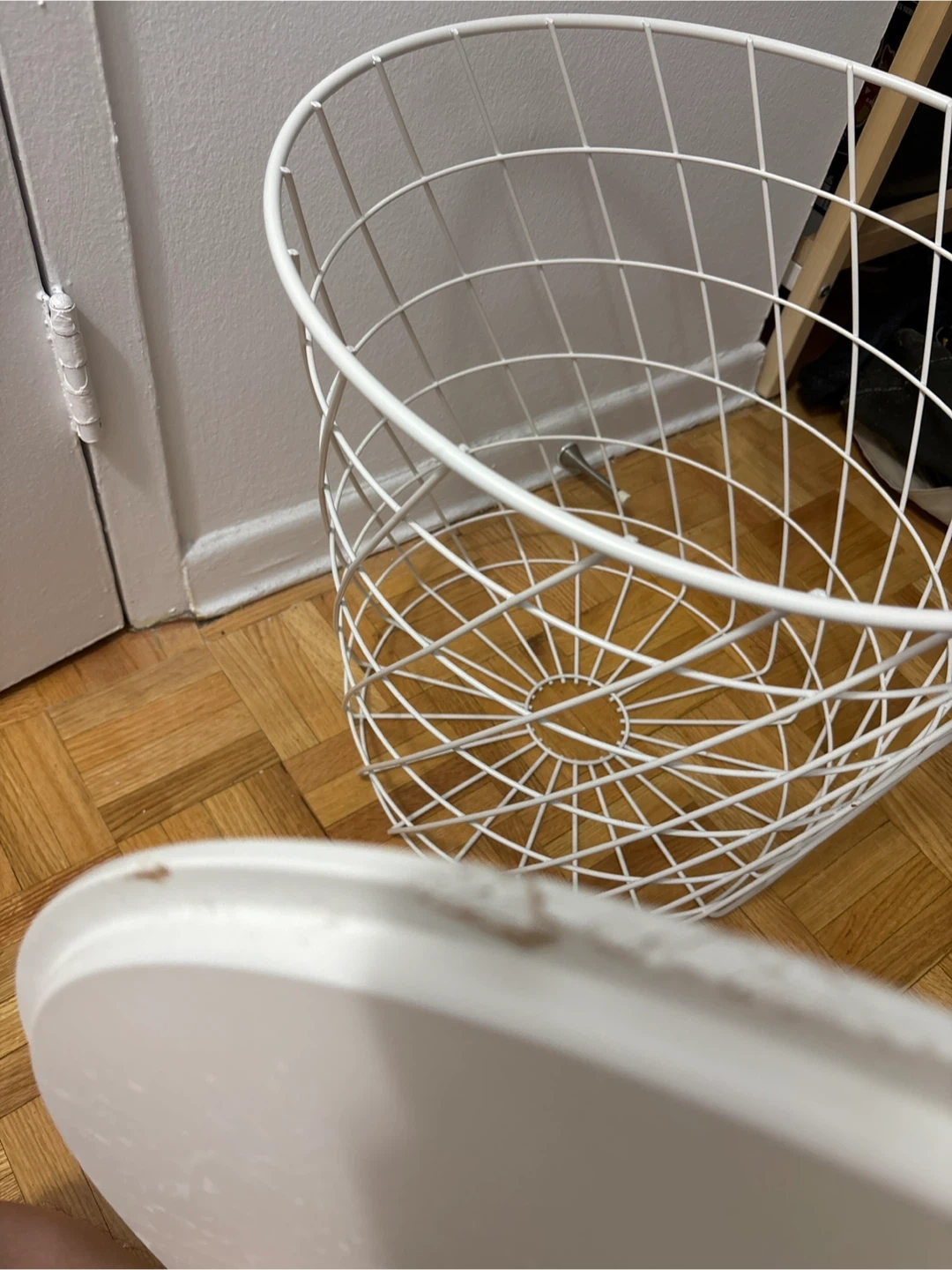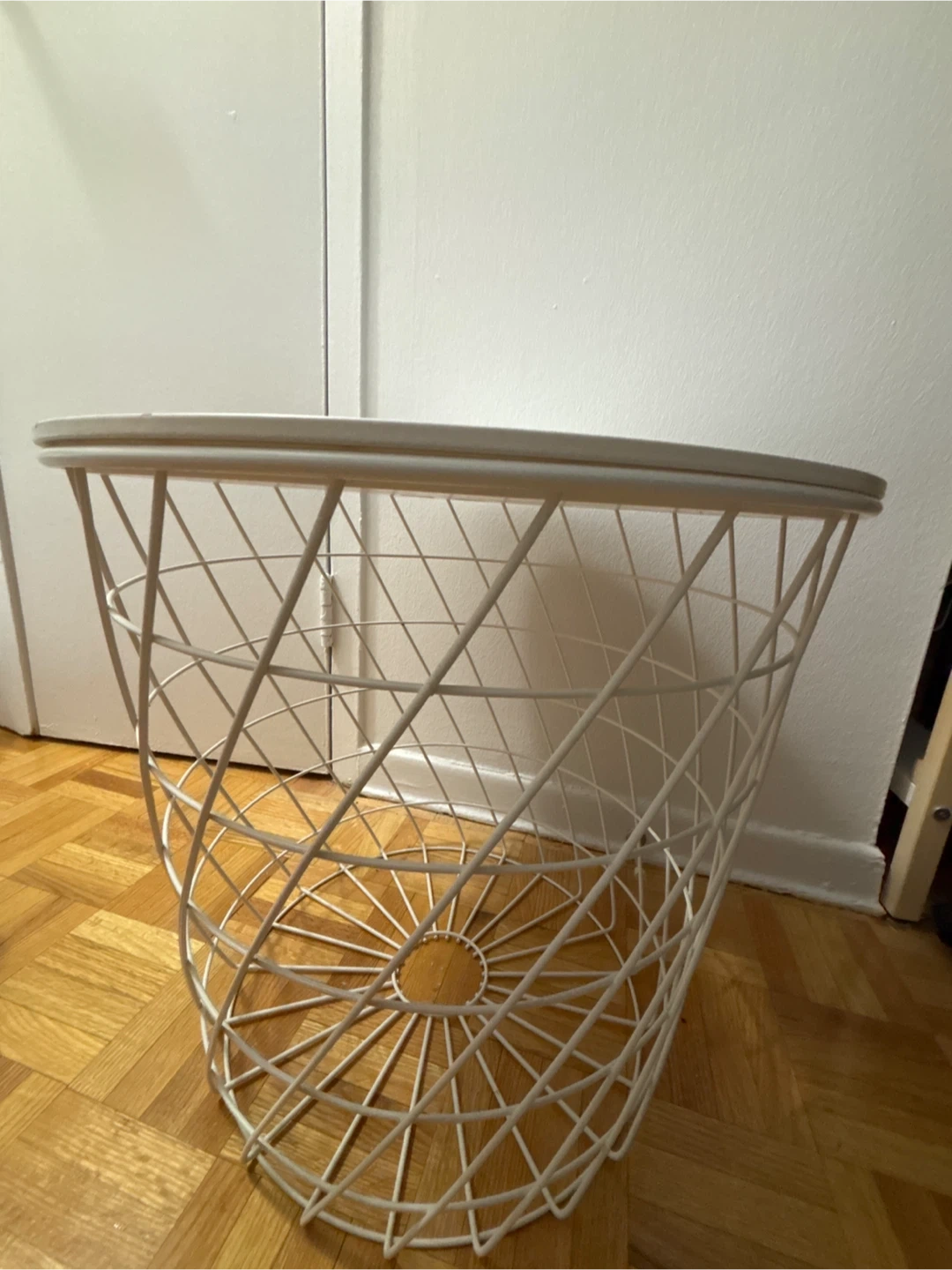 Selling a white wire side table. It has a circular top and a unique wire base design. There are some signs of wear on the top edge, as shown in the photos, but it's still a sturdy and stylish piece for any room hence the low price.