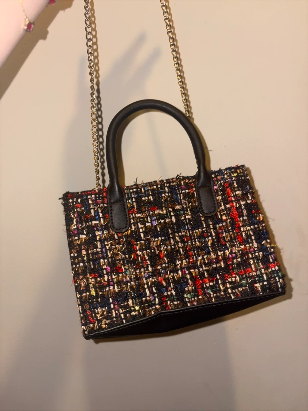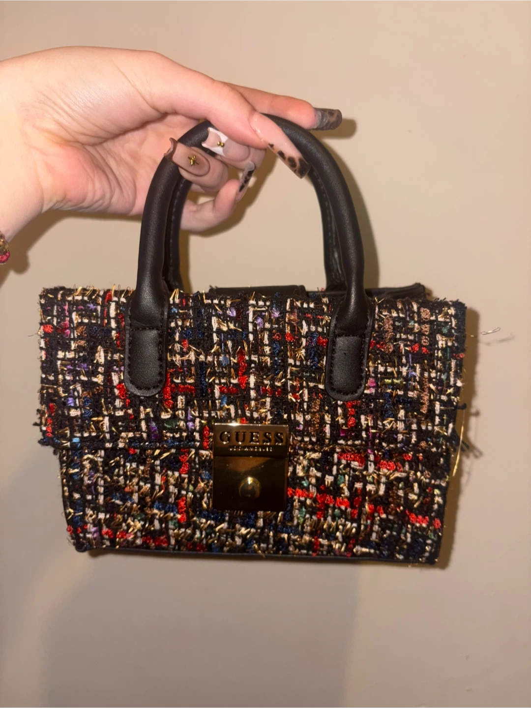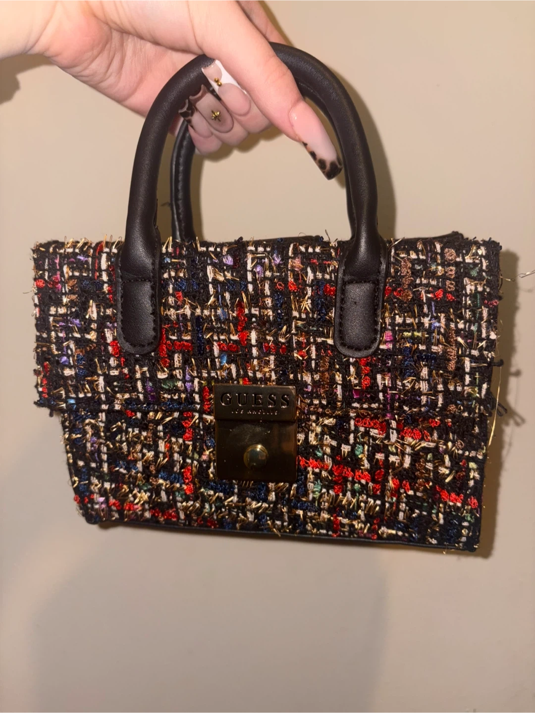 Check out this cute Guess mini top handle bag! It features a tweed design with black leather handles and a gold chain strap. It's perfect for adding a touch of style to any outfit