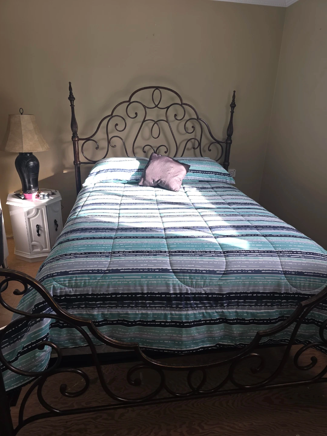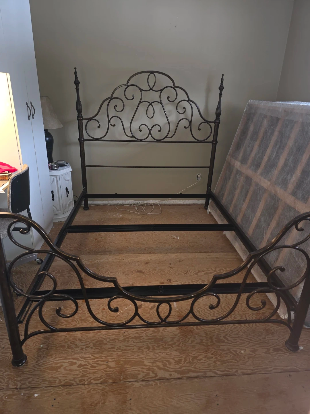 Selling a beautiful wrought iron bed frame, queen size. This bed frame will add a touch of elegance to any bedroom. The intricate design and sturdy construction make it a timeless piece. It's in great condition and ready for a new home!