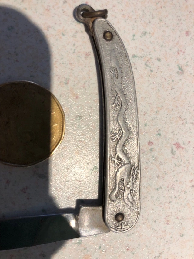 For sale are two used pocket knives. The first is a small pocket knife with a stainless steel blade and a dragon design on the handle. The second is a larger, multi-blade pocket knife with a wood handle.
