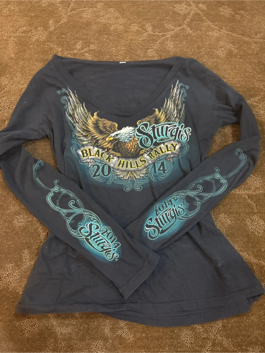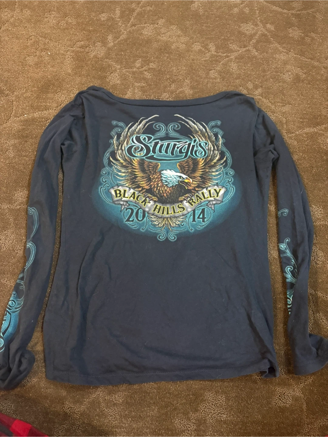 Here's a long-sleeved shirt featuring the Sturgis Black Hills Rally from 2014! It has a cool design with an eagle and the rally details. It's in good condition and ready for a new owner.