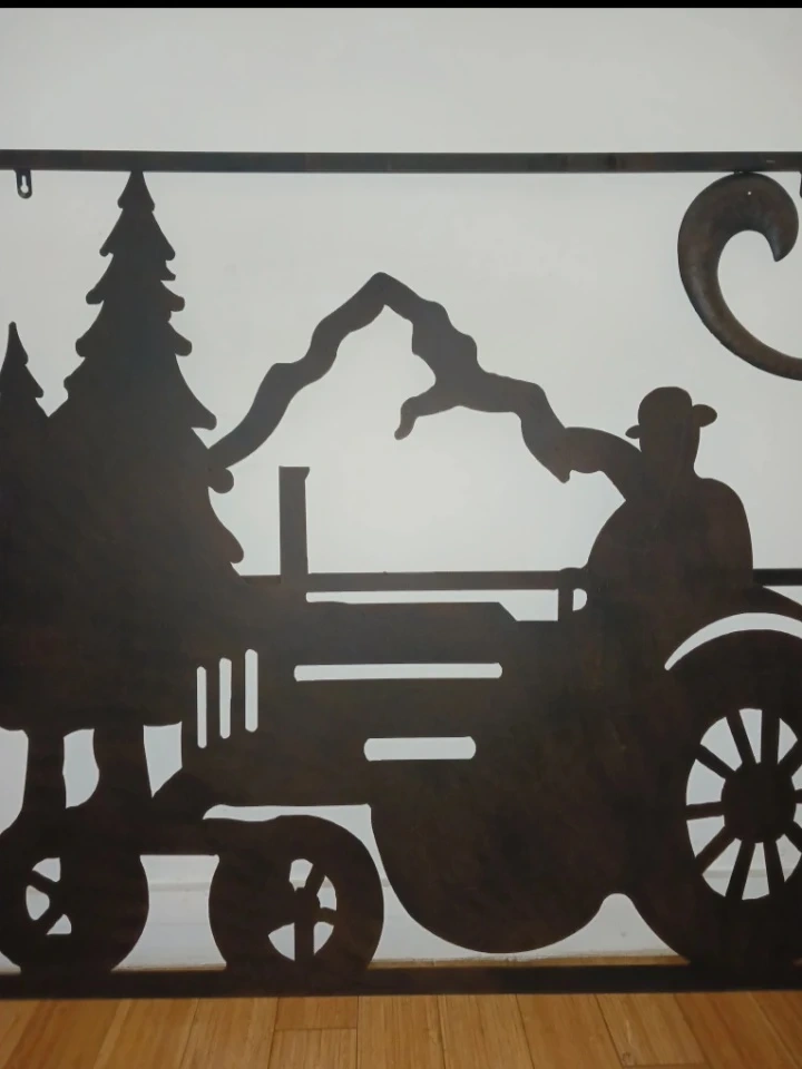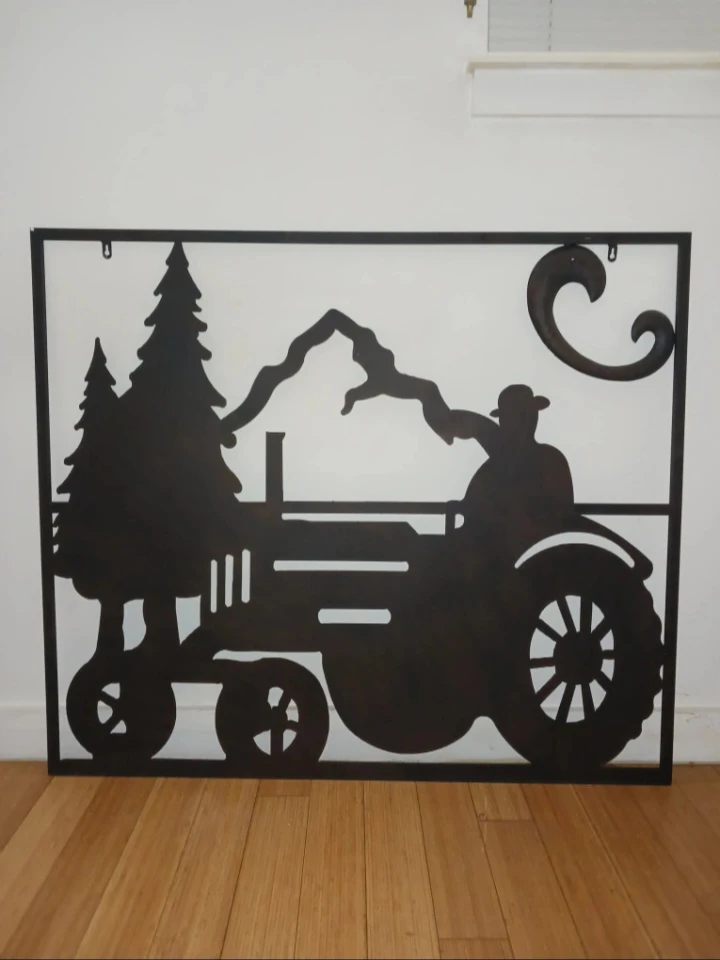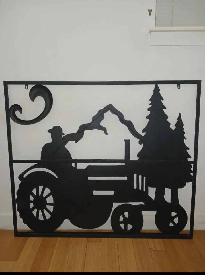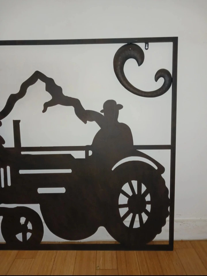 Beautiful metal wall art panel featuring a farmer driving a tractor set against a scenic landscape with mountains, pine trees, and flowing clouds. This piece captures classic rural charm and is a perfect accent for farmhouse or rustic-style spaces.