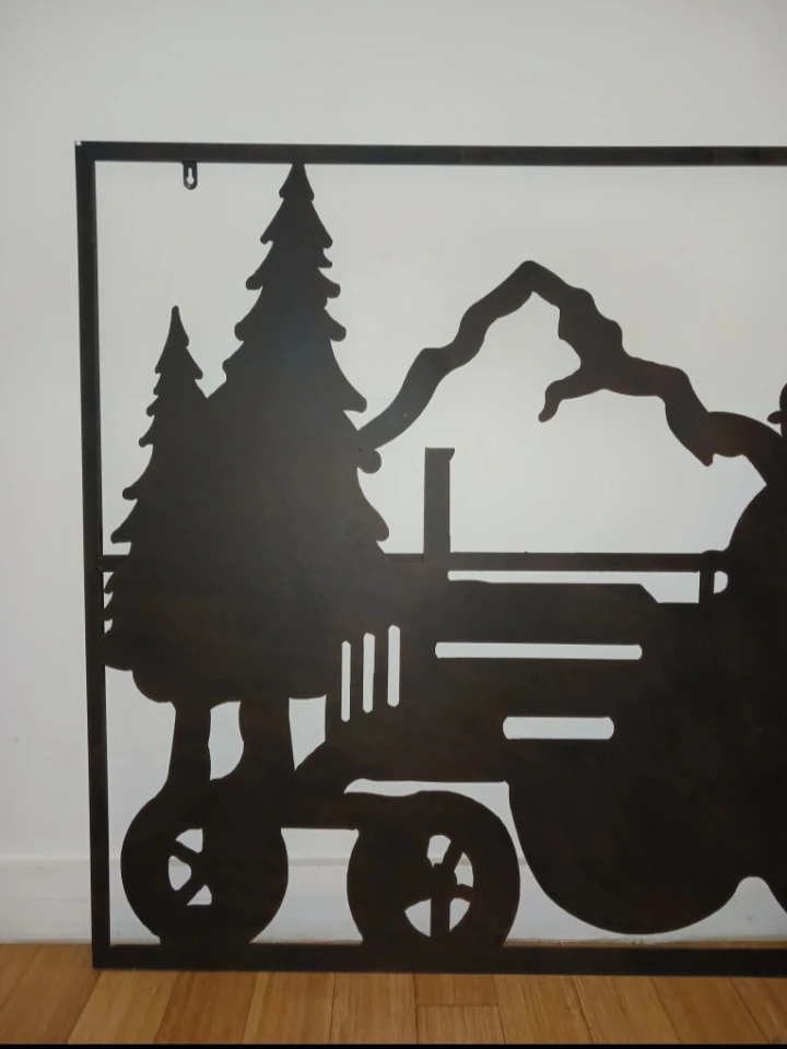 Intricate cut-out design with tractor, trees, and mountain scenery