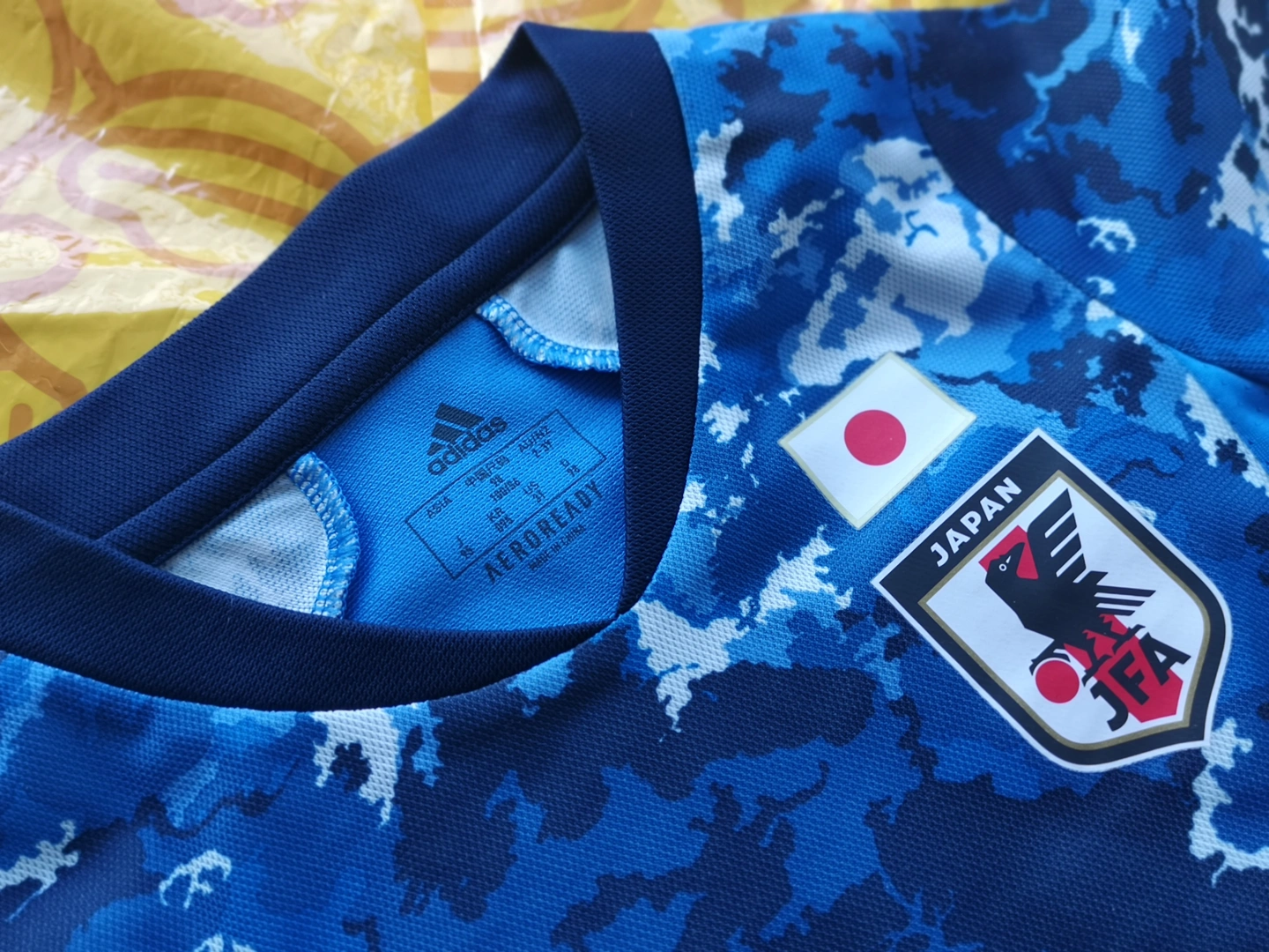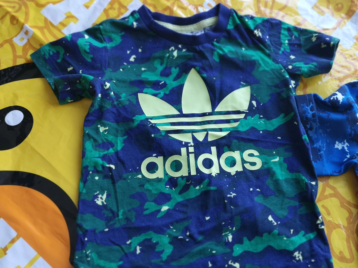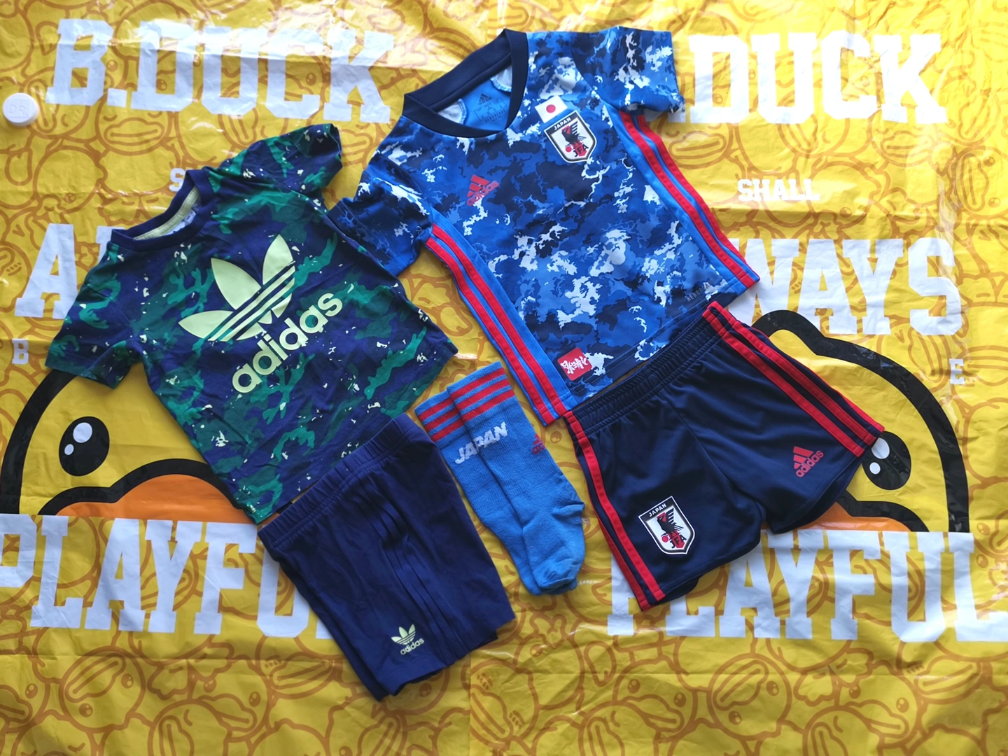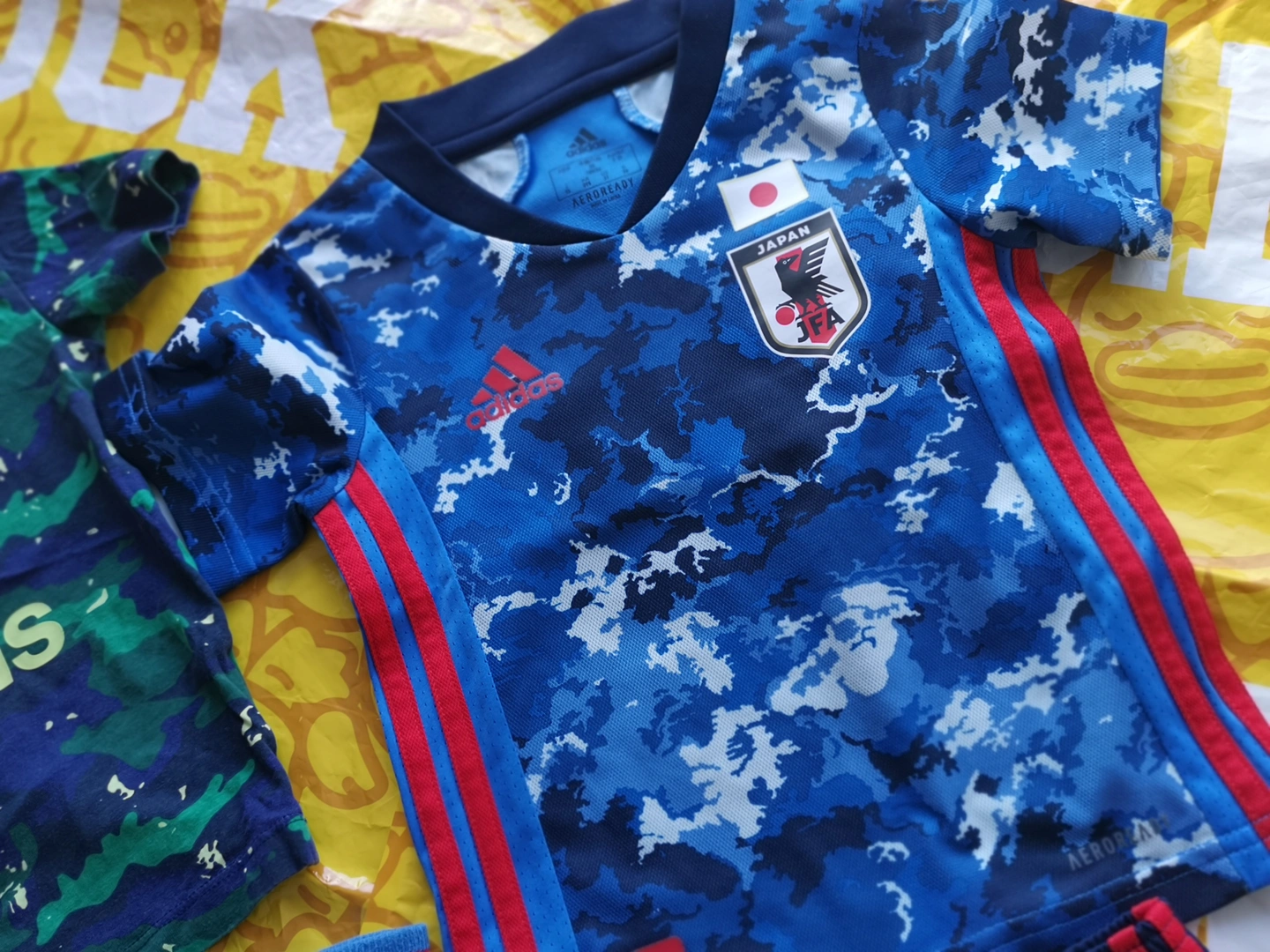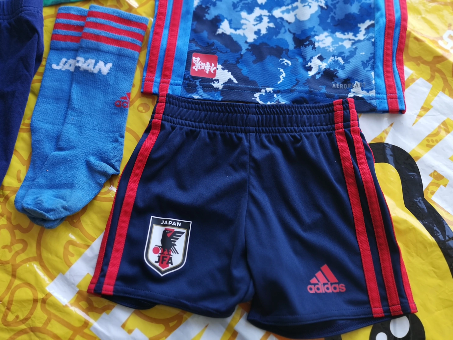 Selling an Adidas Japan soccer jersey set. It includes a blue camo jersey, navy shorts, a green camo shirt and socks. Great for any young soccer fan!