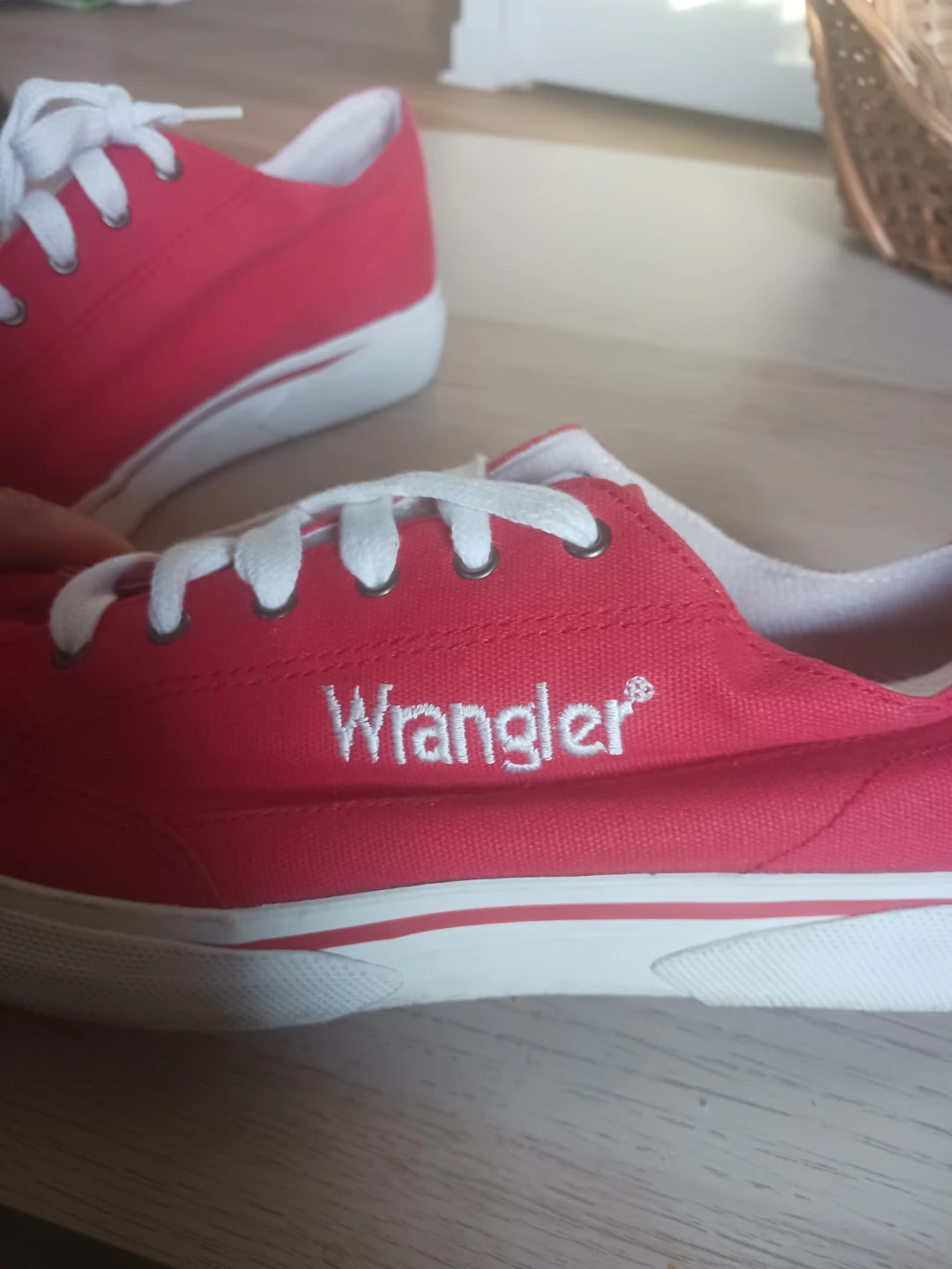 Selling a pair of red Wrangler canvas sneakers. They are a size 6 and in great condition. Perfect for casual wear! Men's size 6 not women's never been worn