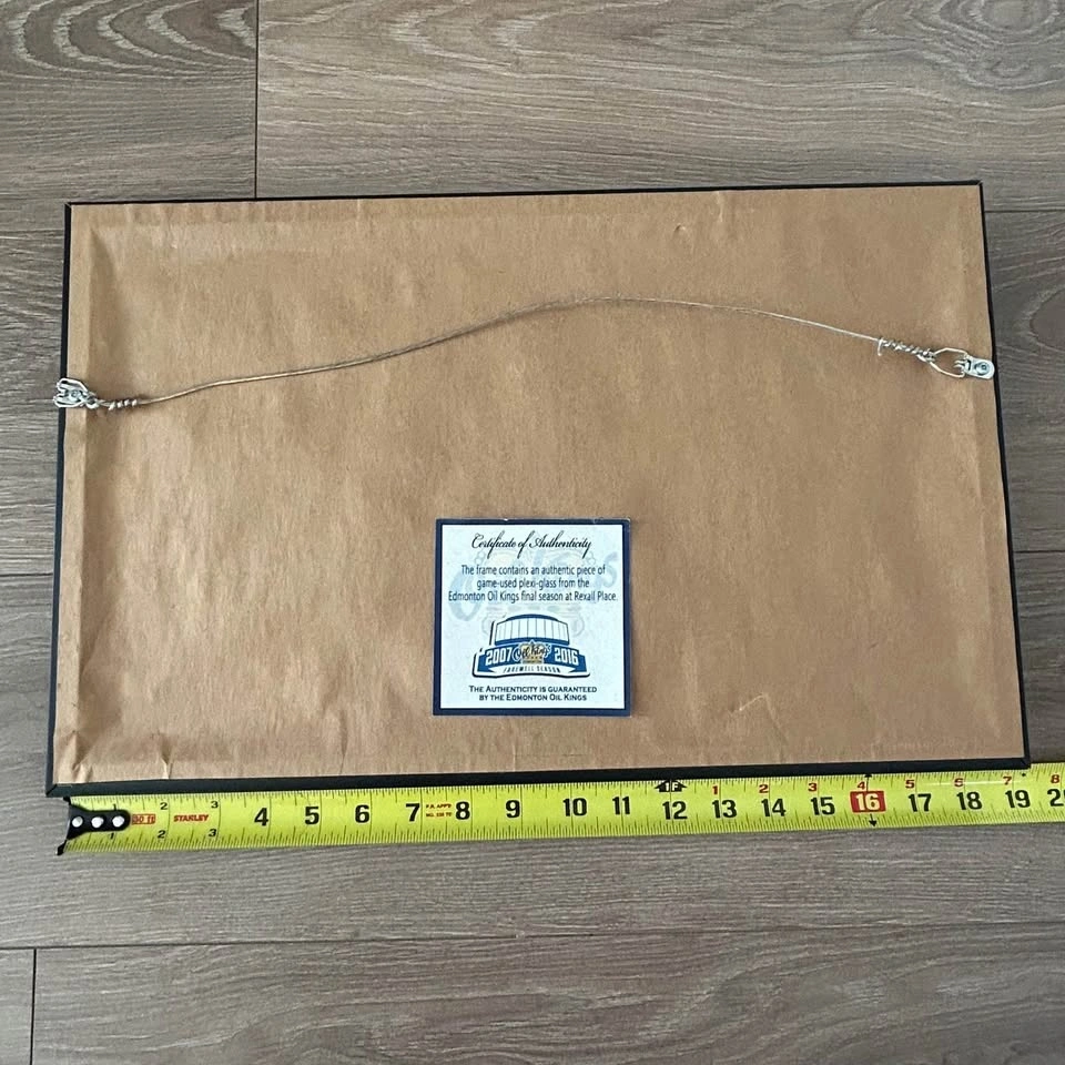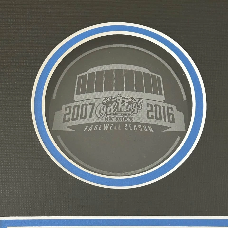 Collectible Edmonton Oil Kings display featuring an authentic piece of game-used plexi-glass from Rexall Place during the historic 2007–2016 Farewell Season.