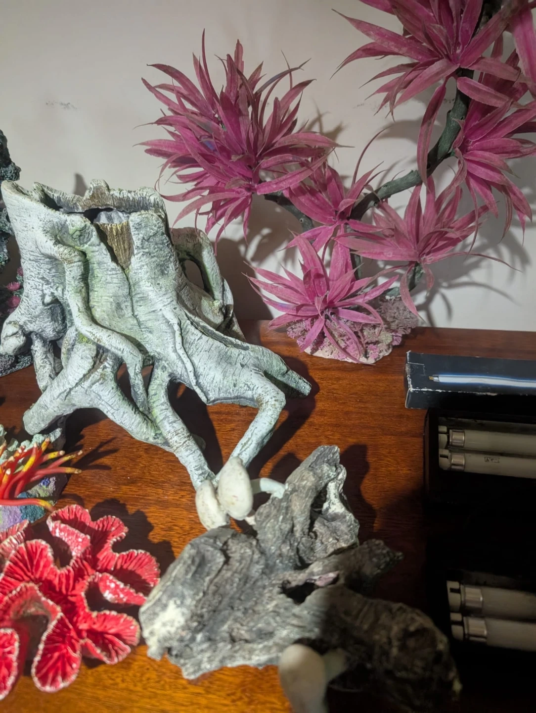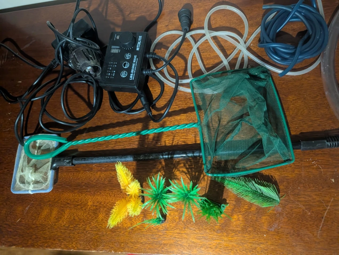 Selling a variety of aquarium decorations and accessories! Includes rocks, coral, plants, a net, and other miscellaneous items. Everything you need to create a beautiful underwater world for your fishy friends. Huge tote full of stuff heaters lights etc