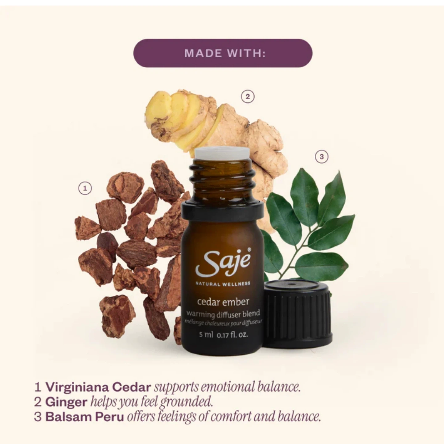 The blend includes Virginiana Cedar, Ginger, and Balsam Peru to support emotional balance and feelings of comfort