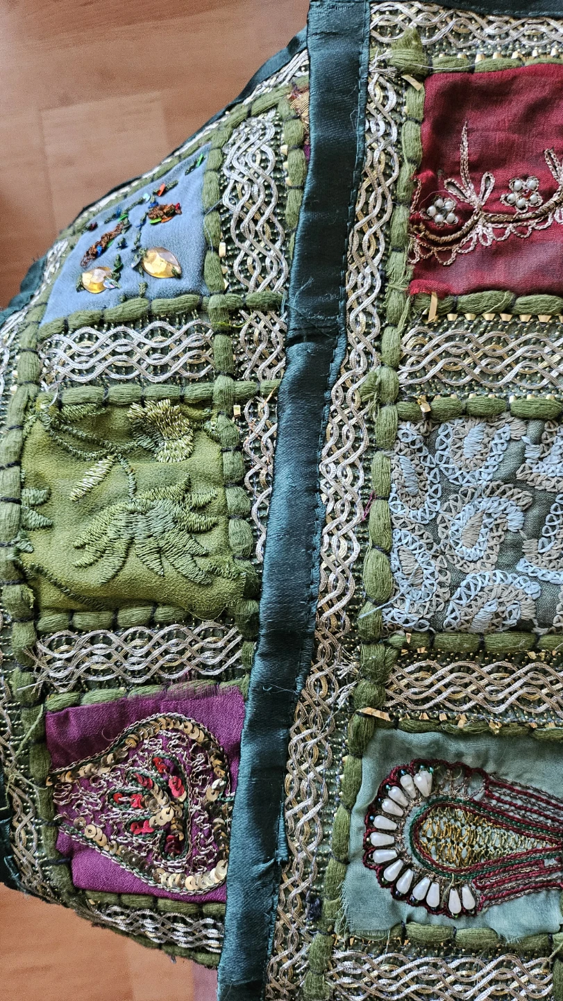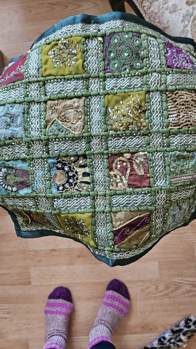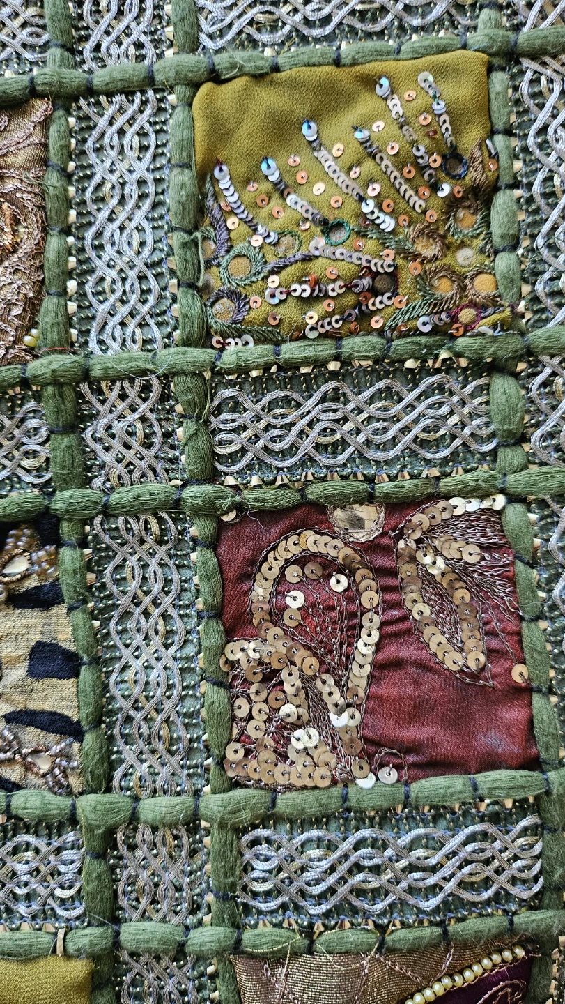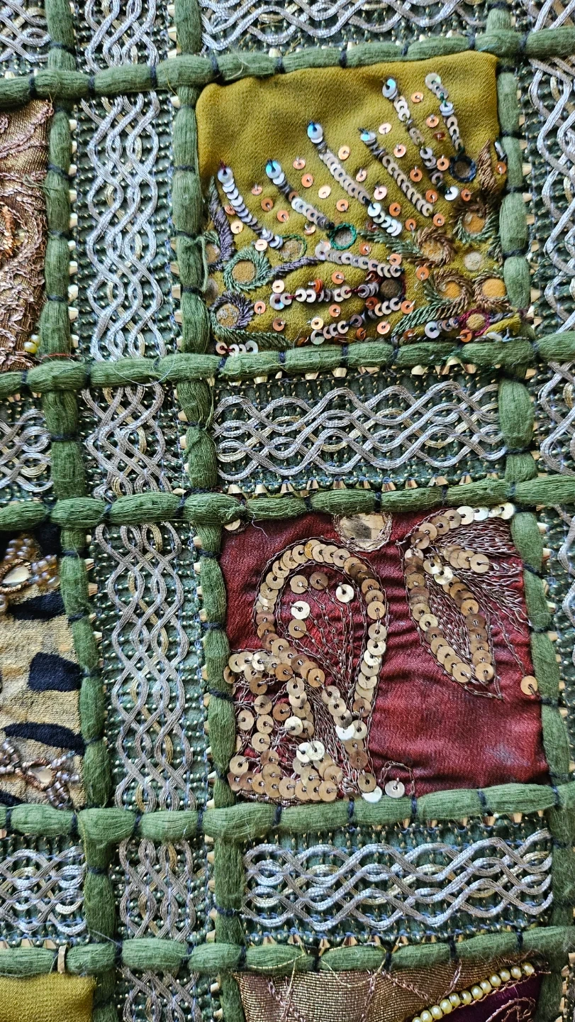 Selling 2 matching decorative cushion cobers with a unique patchwork design. It features various colours and textures, including sequins and embroidery. Perfect for adding a touch of bohemian style to your living space. 40cm×40cm.