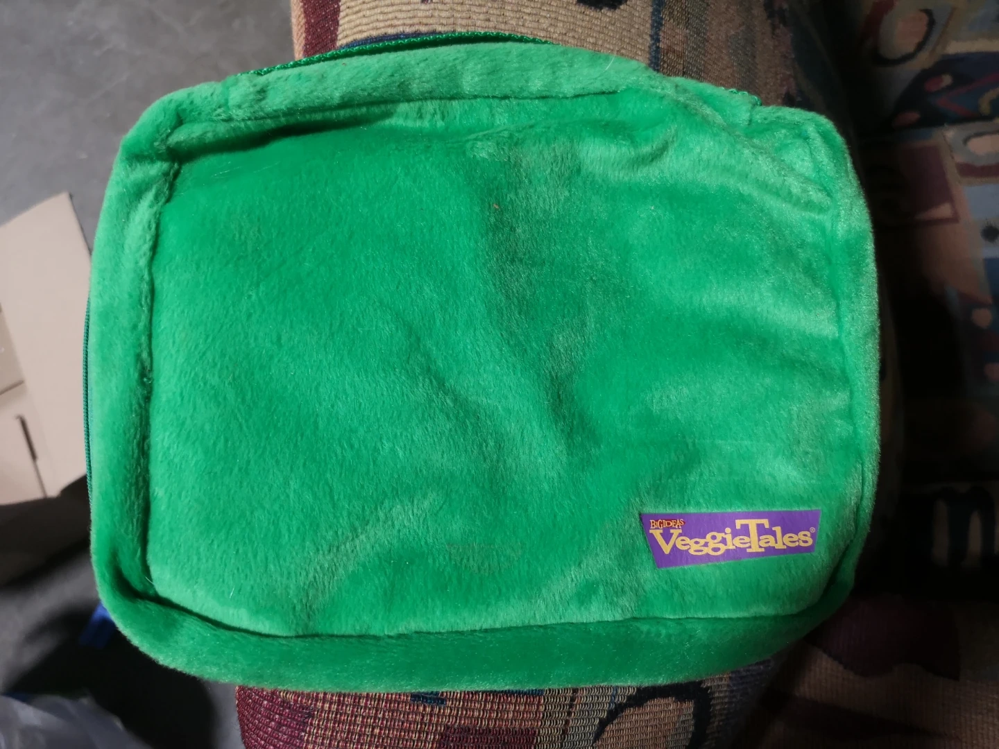 Here's a super cute VeggieTales lunch bag featuring Larry the Cucumber! It's green and plush, perfect for keeping your snacks safe and bringing a smile to lunchtime. It's in great shape and ready for a new adventure