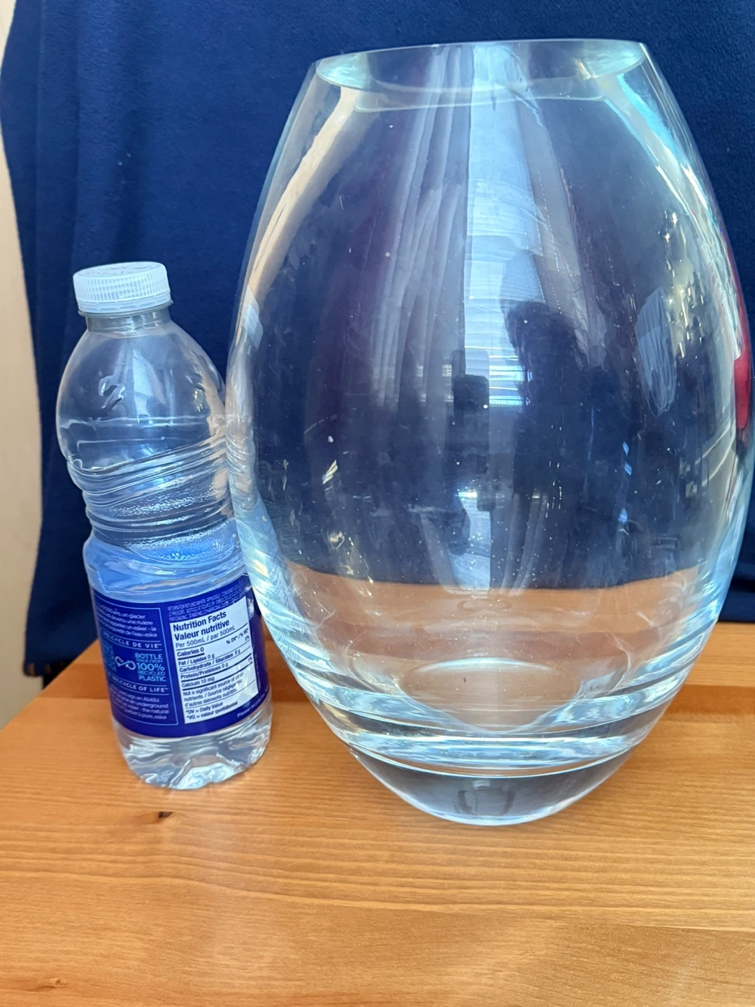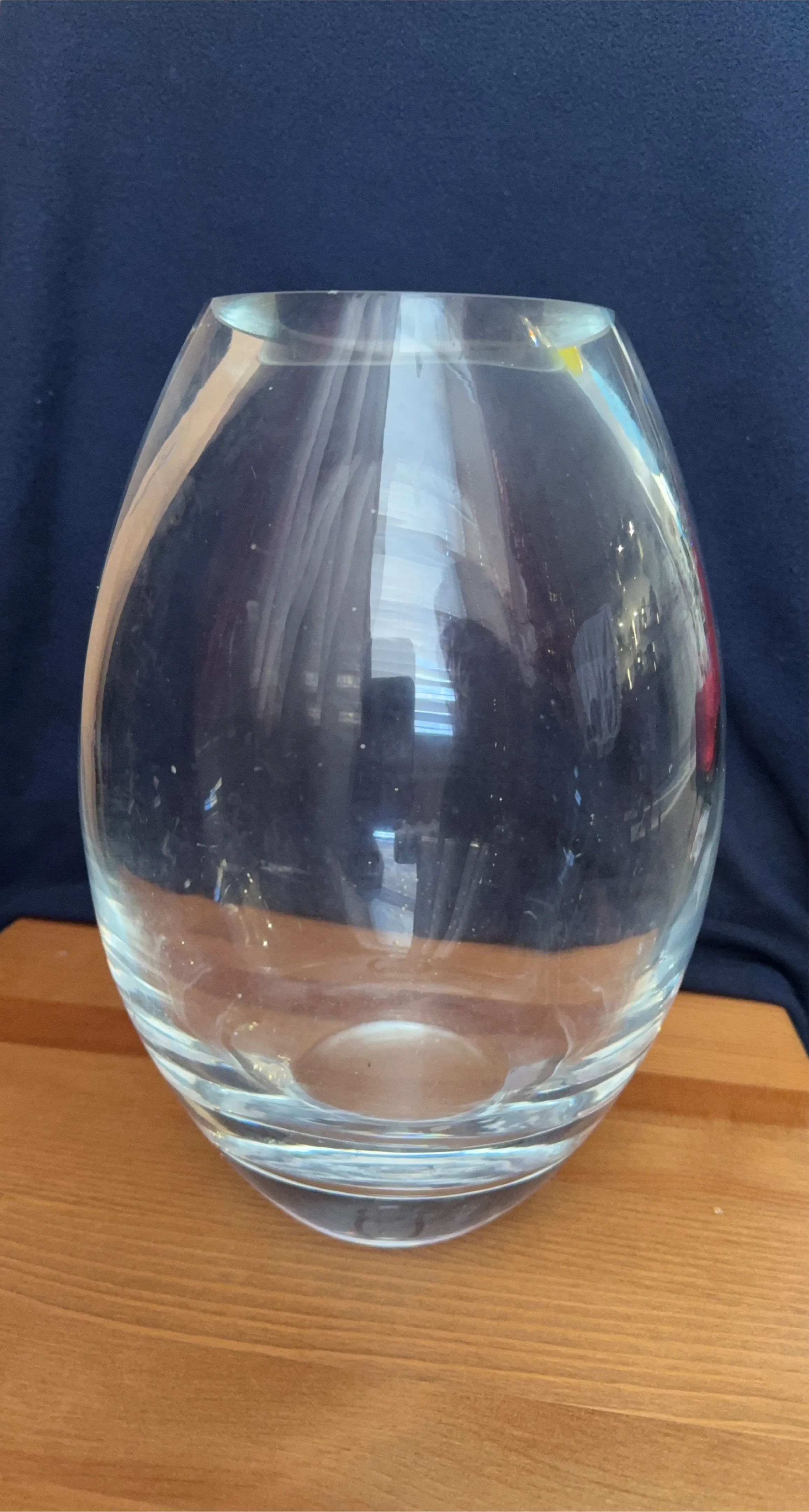 Selling a clear, round glass vase. No crack or damage. Ready to hold your favourite flowers or be a decorative piece!