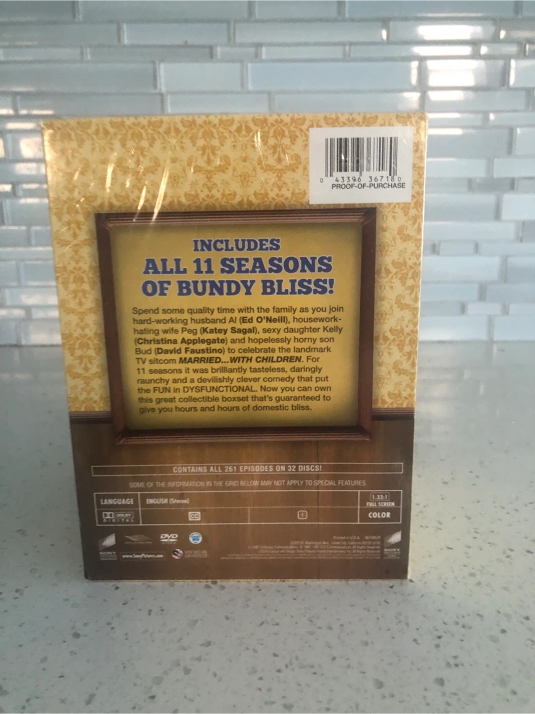 Selling the complete series of Married...With Children on DVD! Includes all 11 seasons and 261 episodes on 32 discs. Spend some quality time with the Bundy family as you join hard-working husband Al (Ed O'Neill), housewife-hating wife Peg (Katey Sagal), sexy daughter Kelly (Christina Applegate), and cluelessly horny son Bud (David Faustino) to celebrate the landmark TV sitcom MARRIED...WITH CHILDREN!