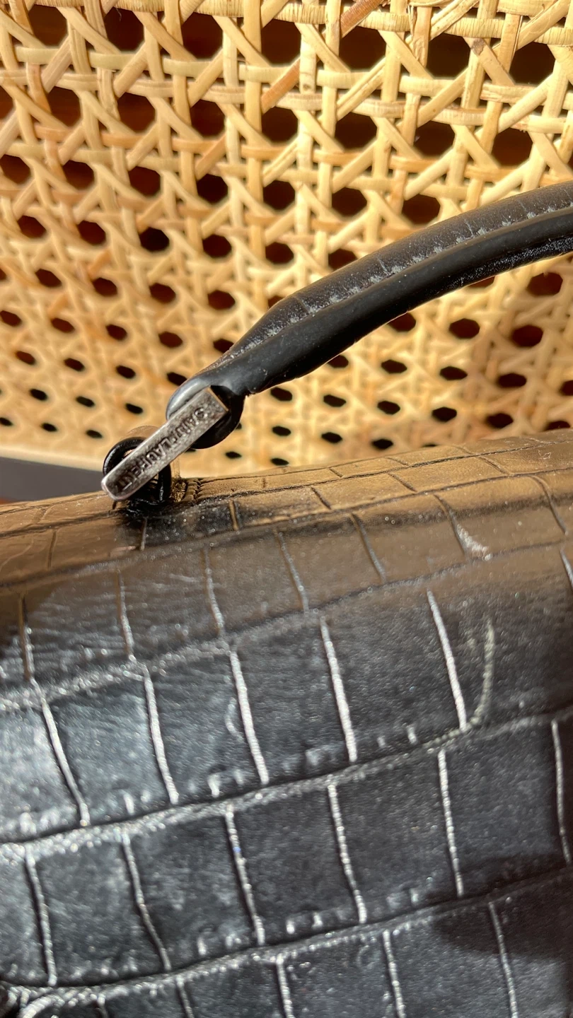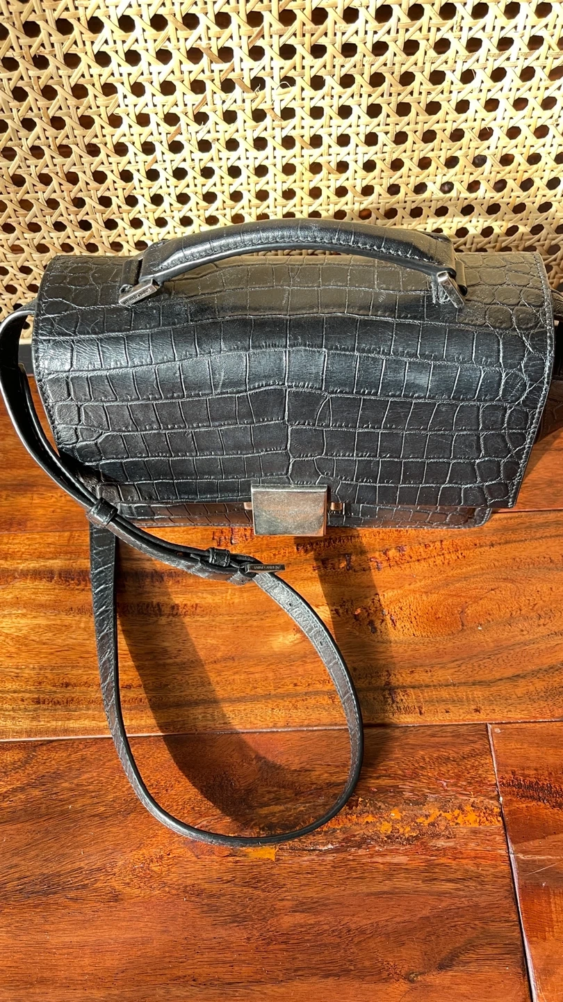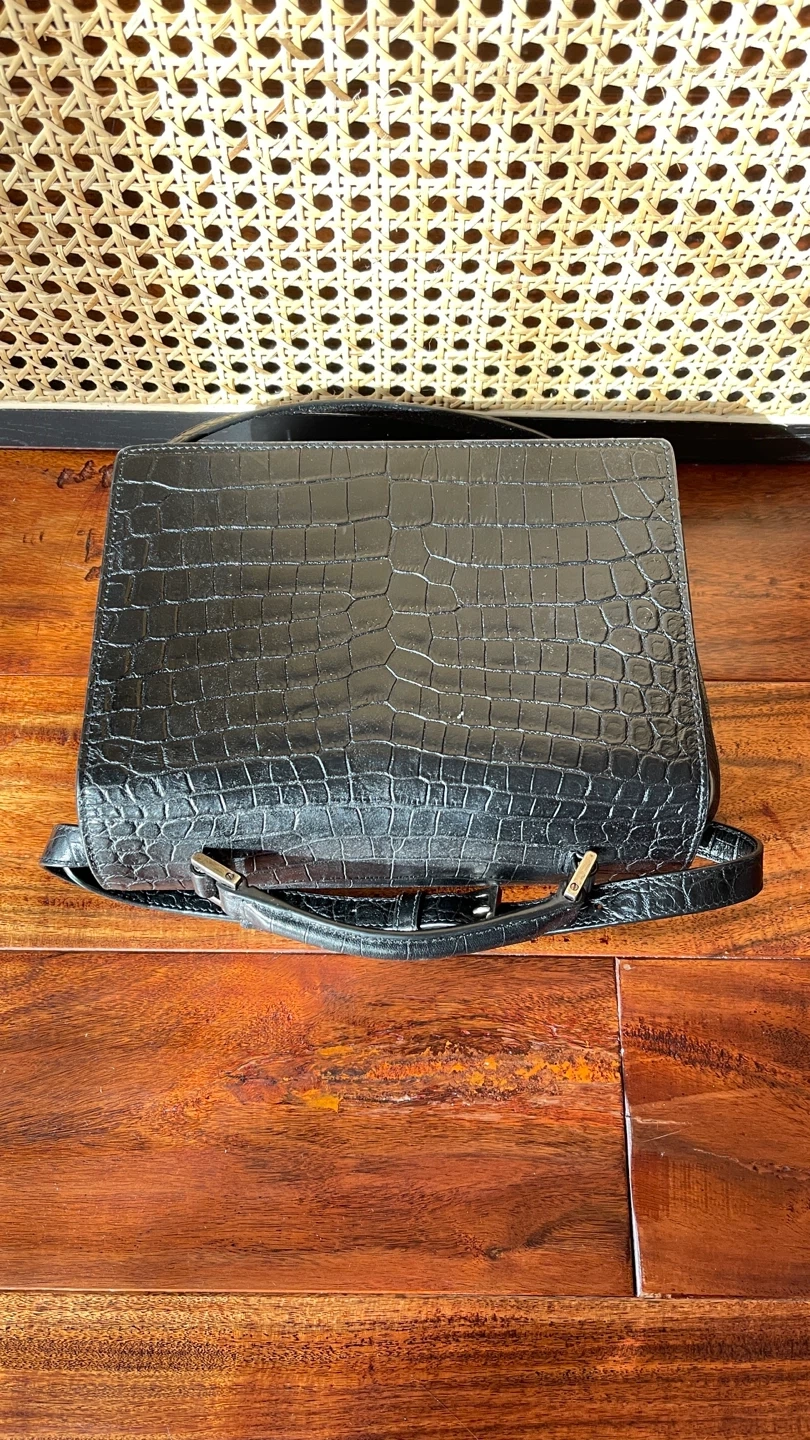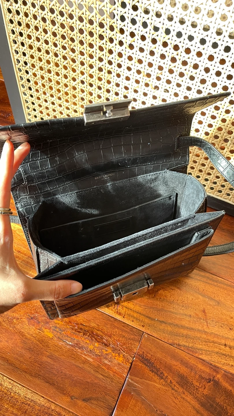 Selling a stylish Saint Laurent handbag in black embossed leather. It's a beautiful piece that adds a touch of elegance to any outfit. The bag features a handle and a shoulder strap for versatile carrying options. Inside, you'll find ample space to keep your essentials organized. Perfect for everyday use or special occasions!