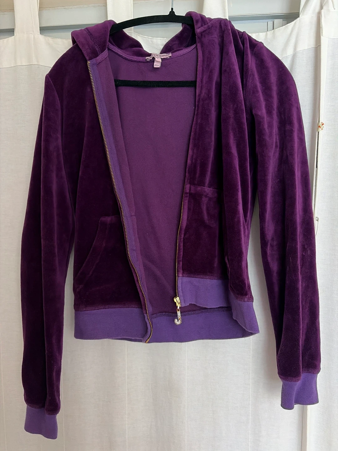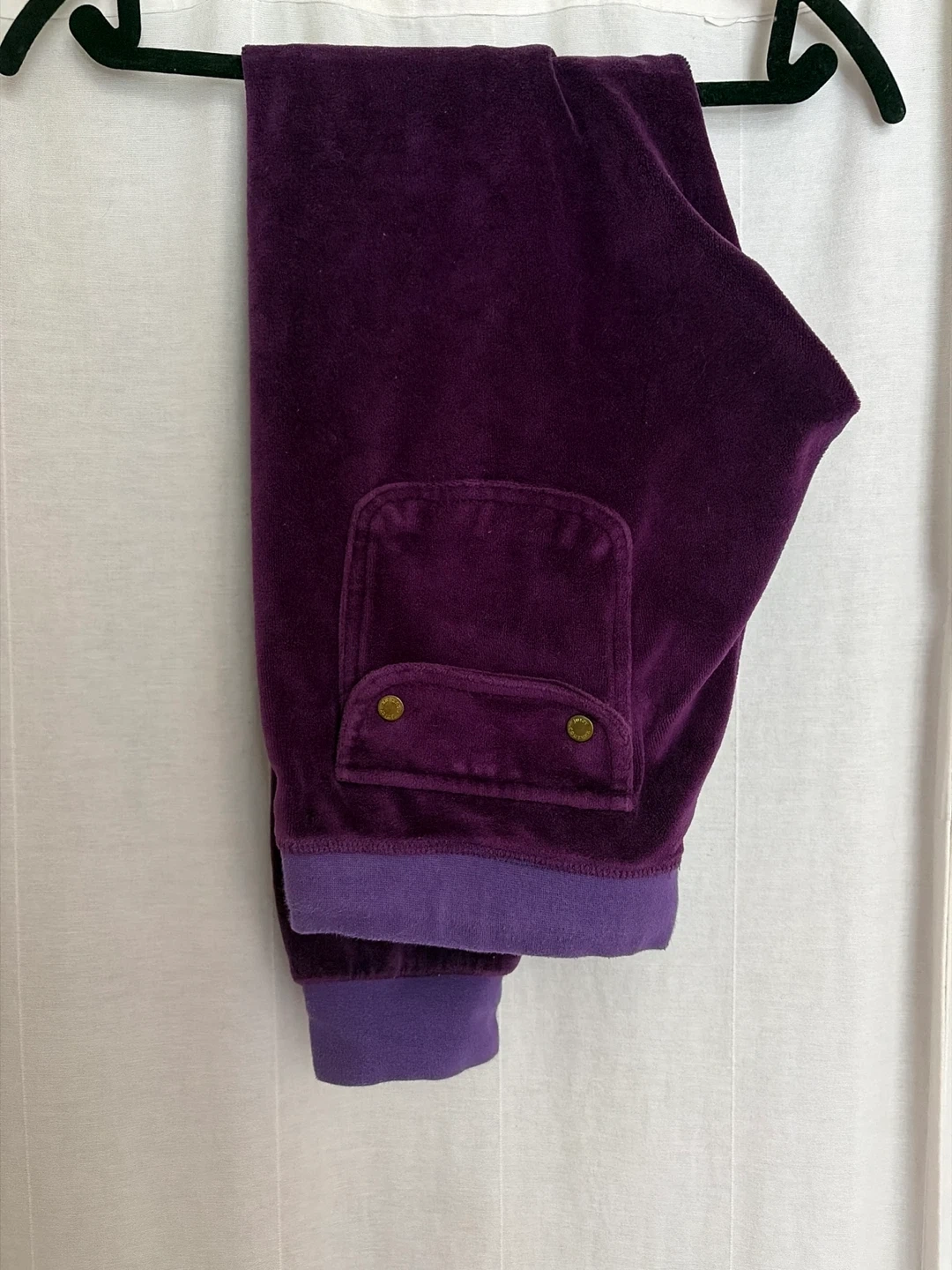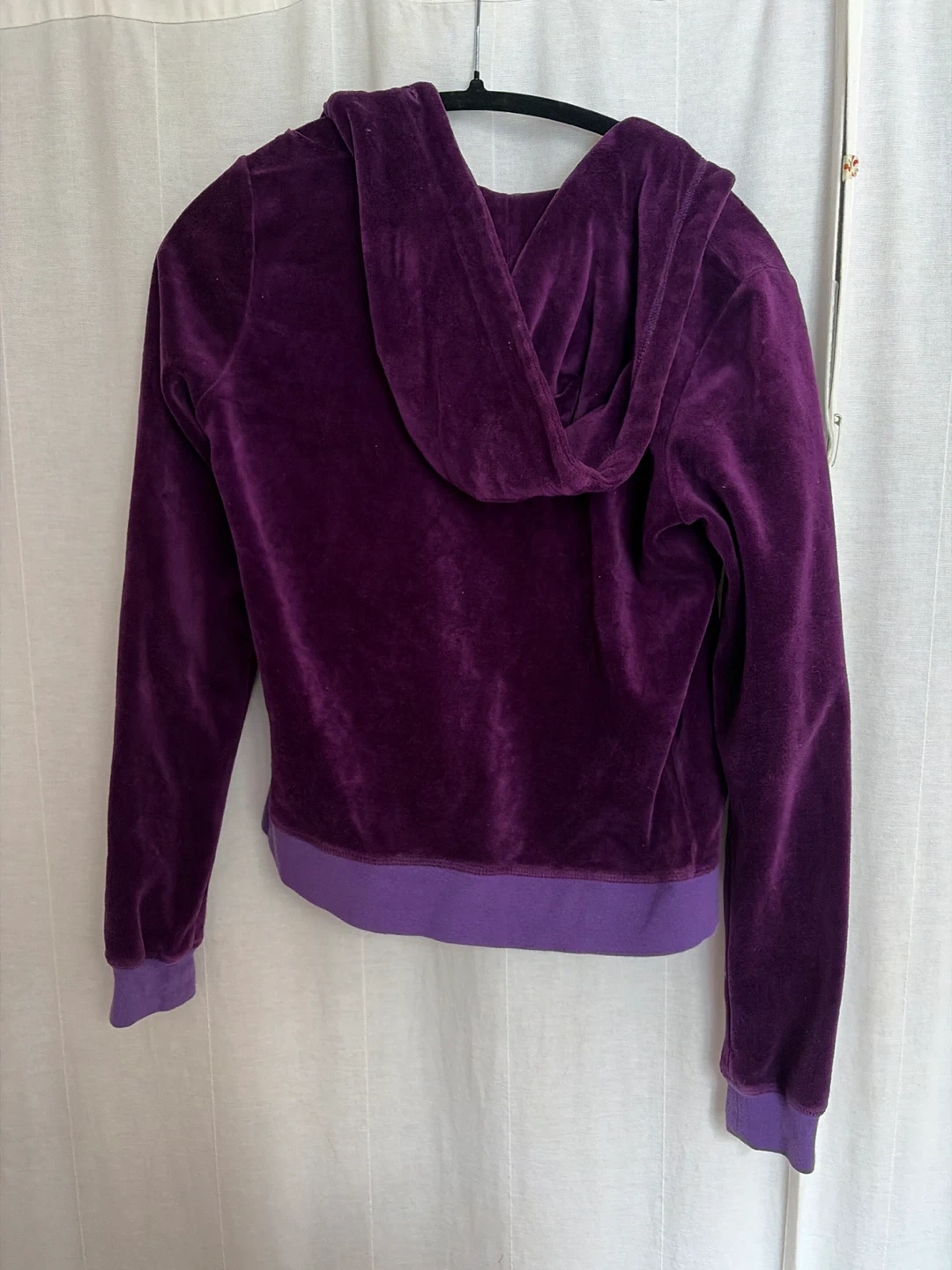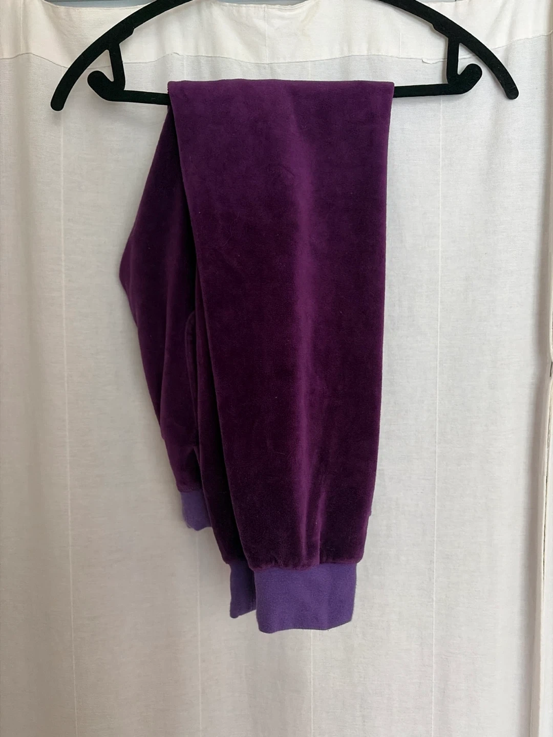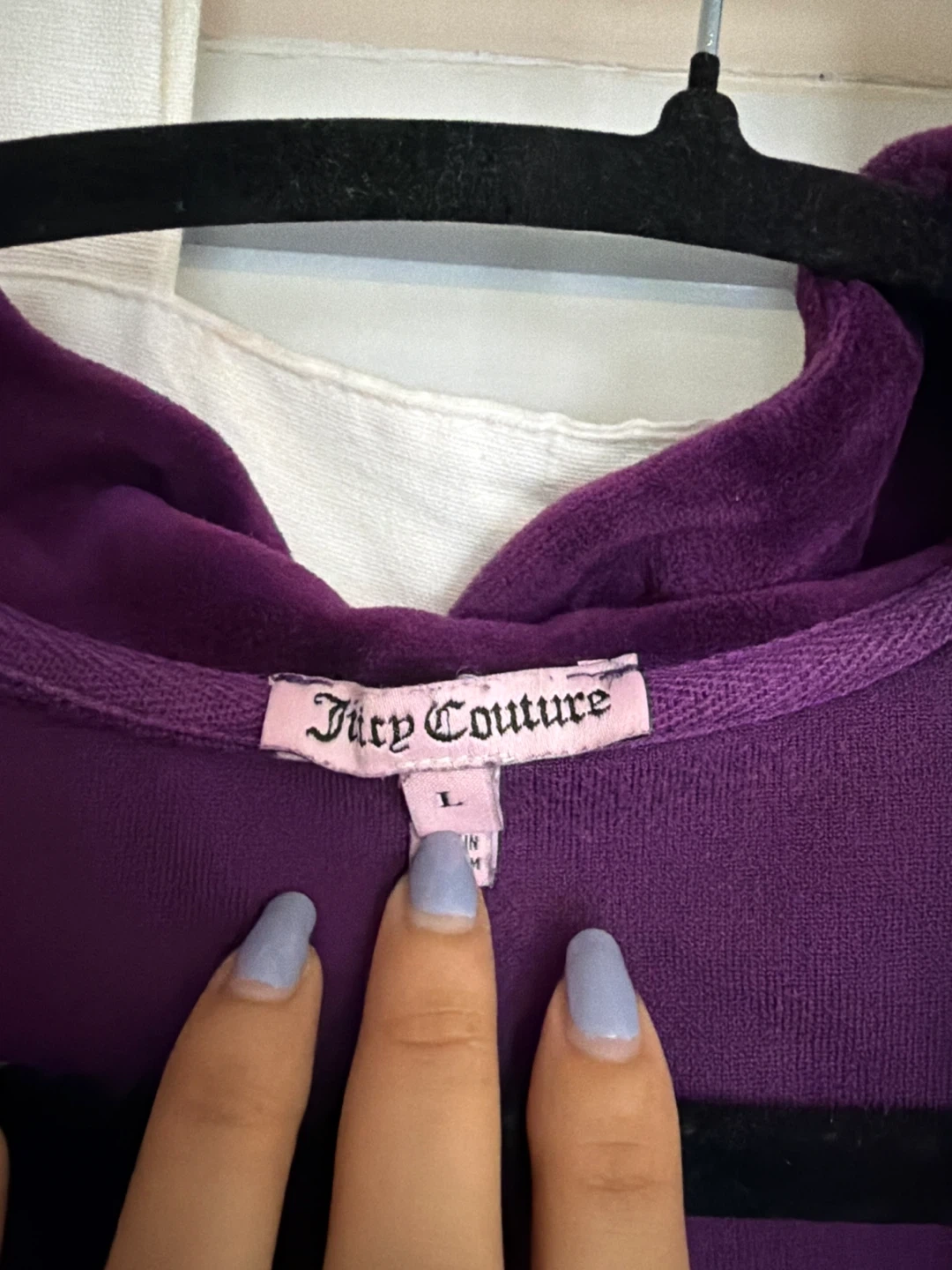 Selling a Juicy Couture velour tracksuit in a beautiful purple colour! The set includes both the zip-up hoodie and the pants. It's a size large and made of soft velour material. Perfect for a comfy and stylish look!