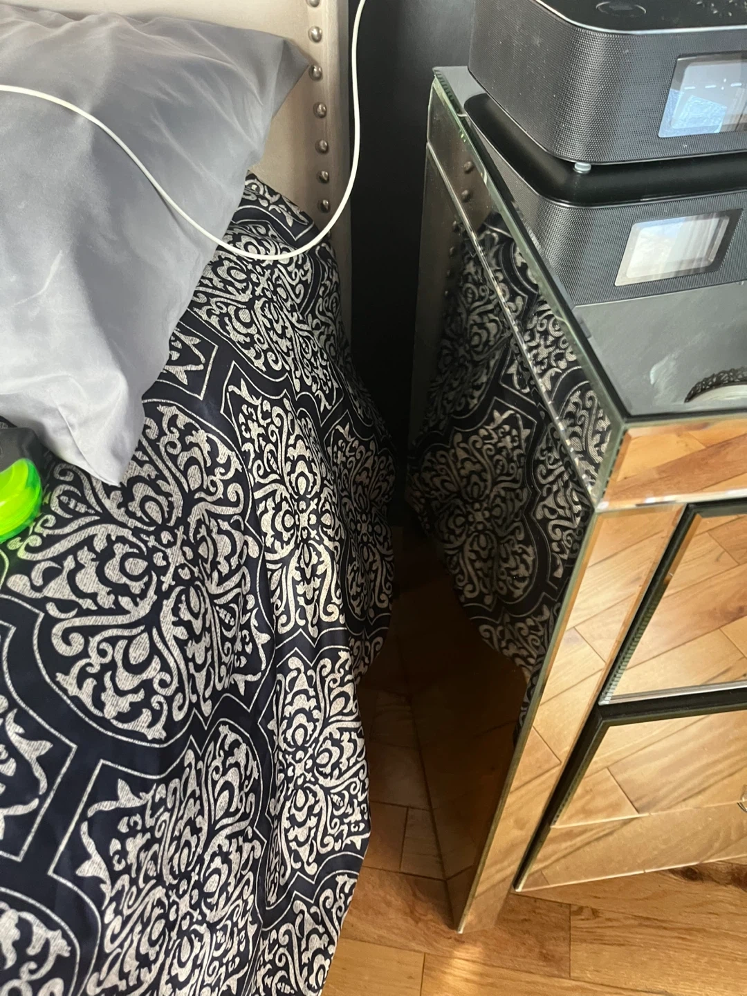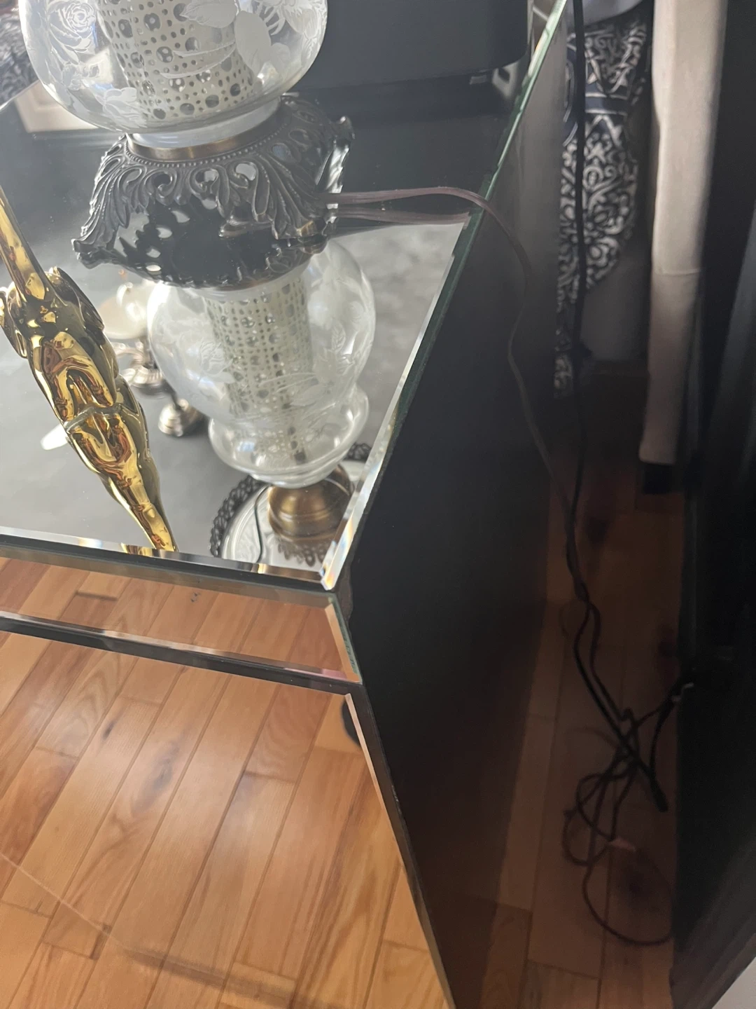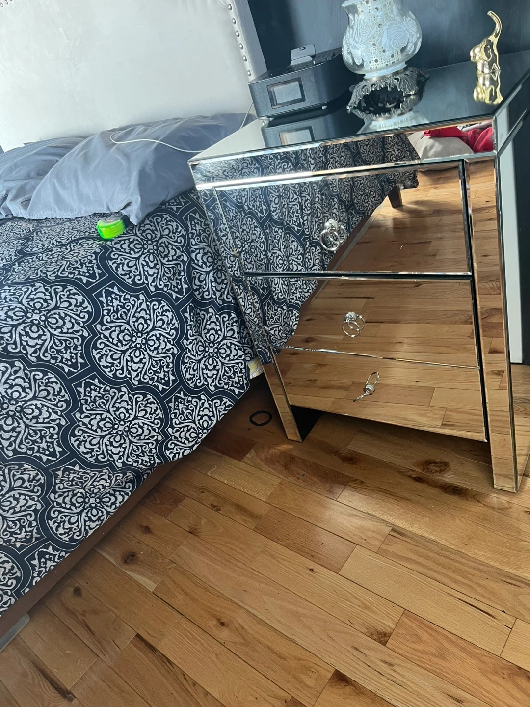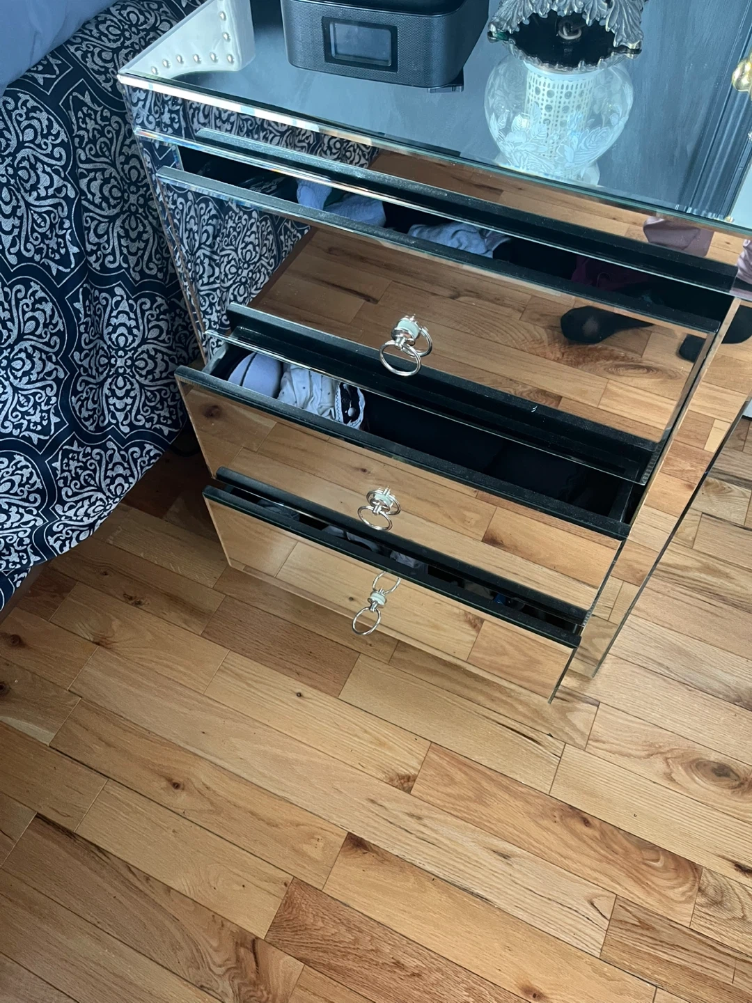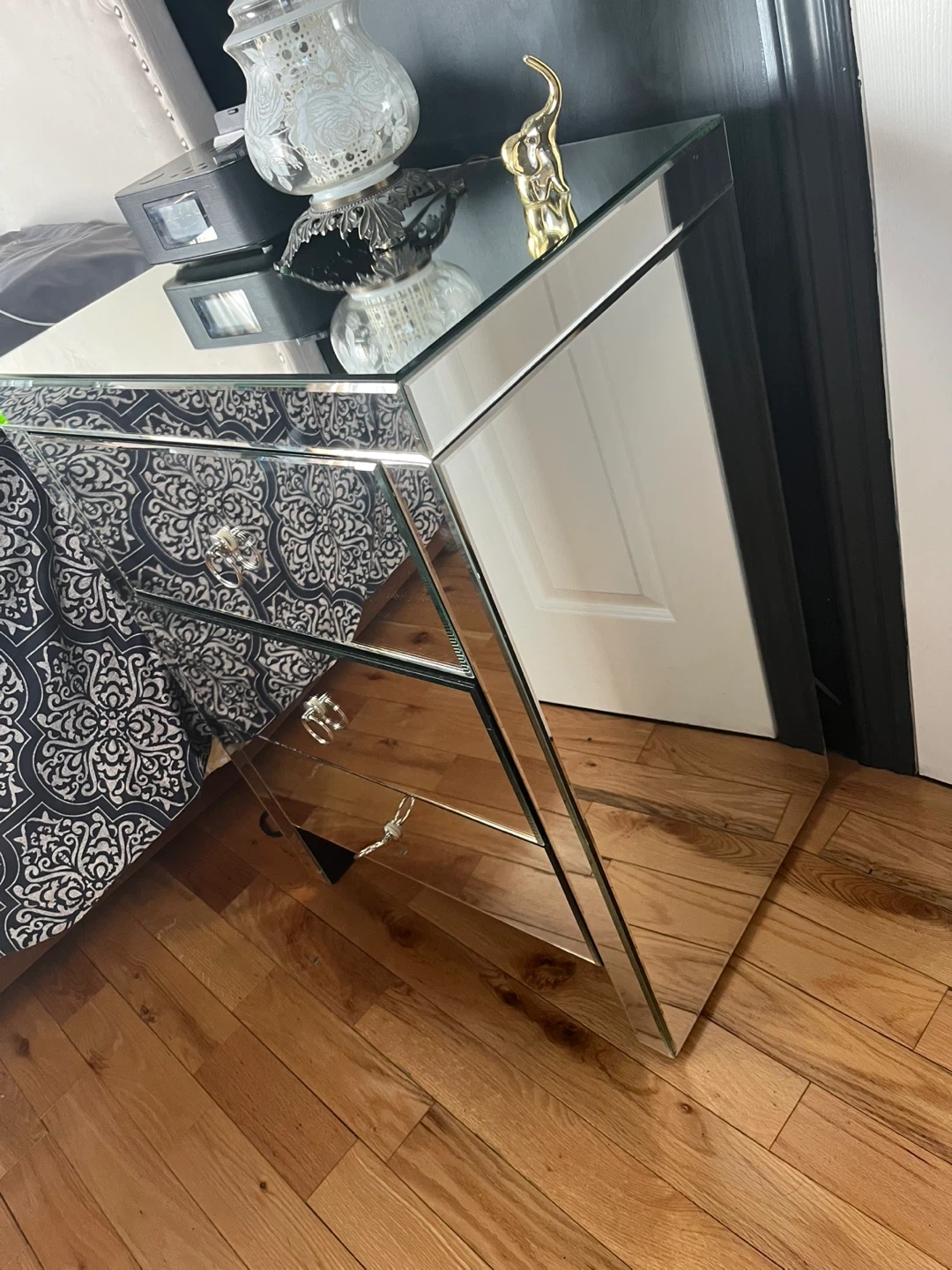 Selling a mirrored nightstand with three drawers. It's in good condition and would be a lovely addition to any bedroom. It has a small crack seen in picture.