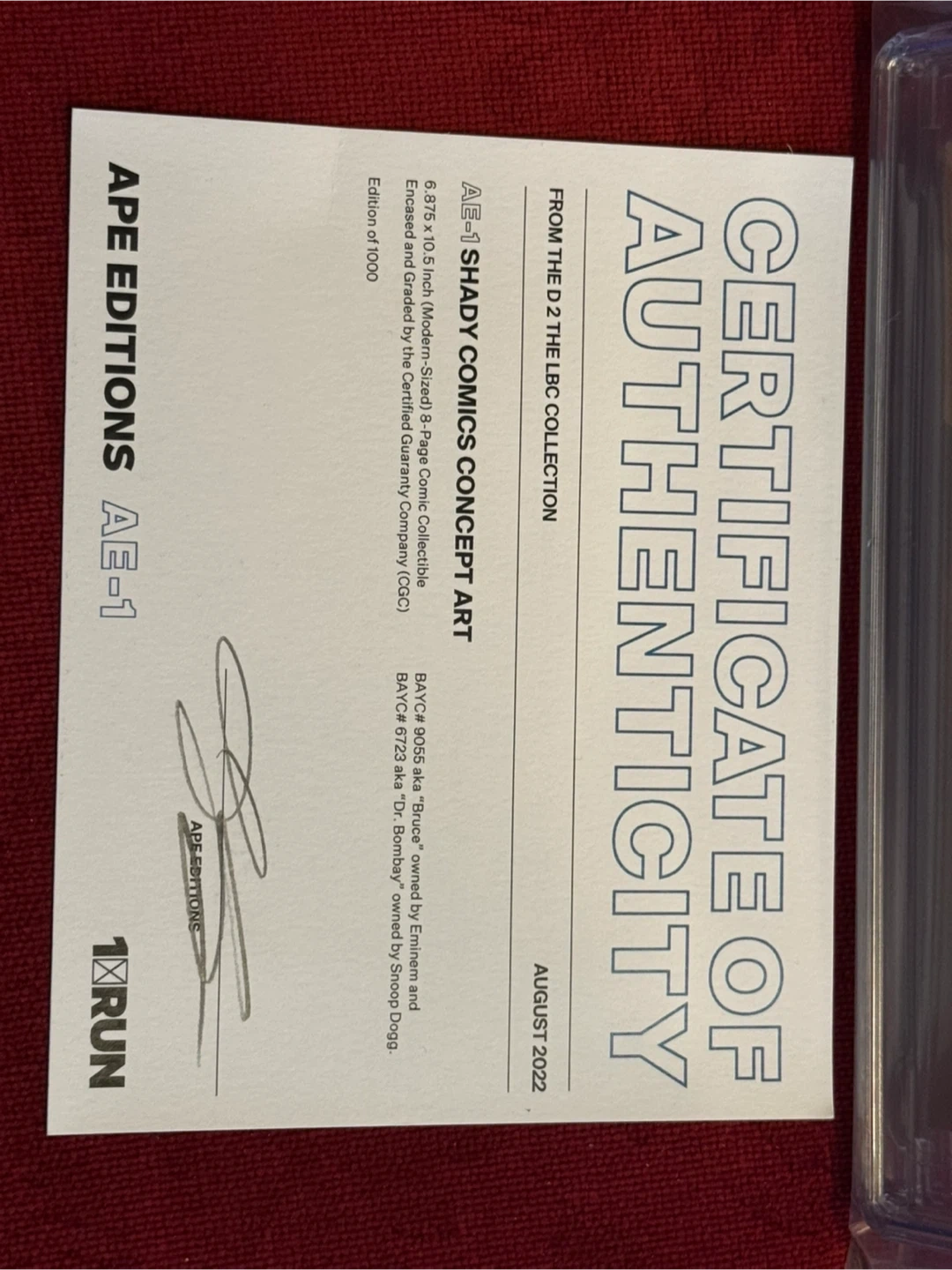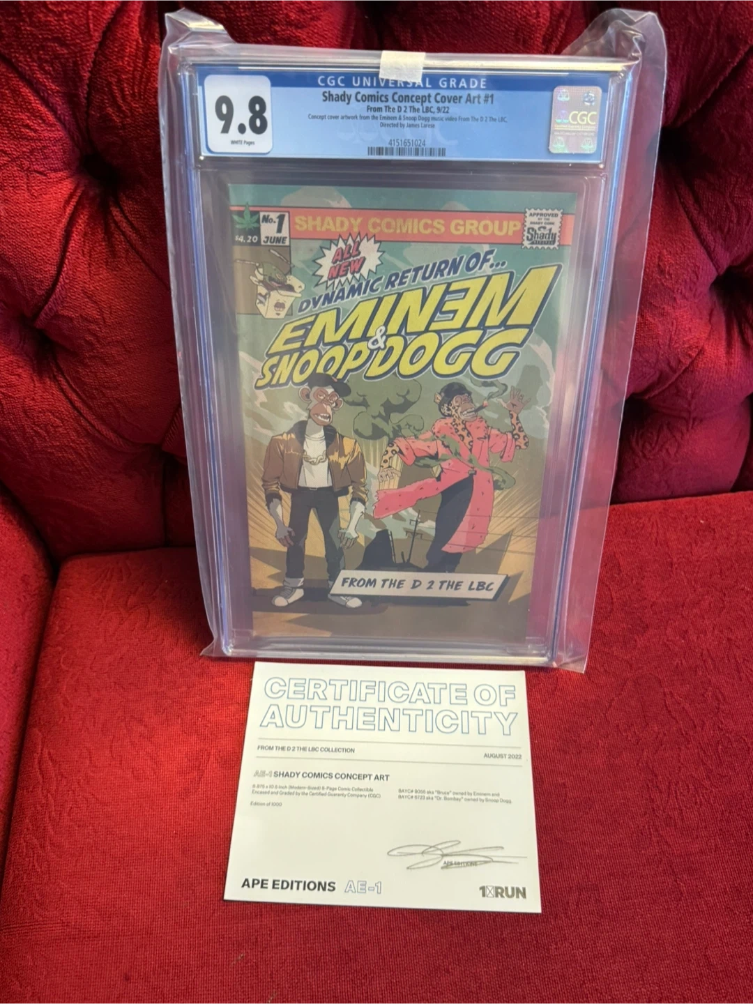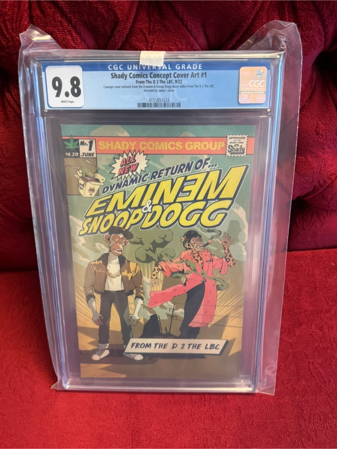 Selling a graded comic book featuring Eminem and Snoop Dogg, Shady Comics Concept Cover Art #1. It has a CGC grade of 9.8. This is from the D 2 The LBC collection. It measures 6.875 x 10.5 inches and is encased and graded by the Certified Guaranty Company (CGC). Edition of 1000. Also includes a certificate of authenticity.