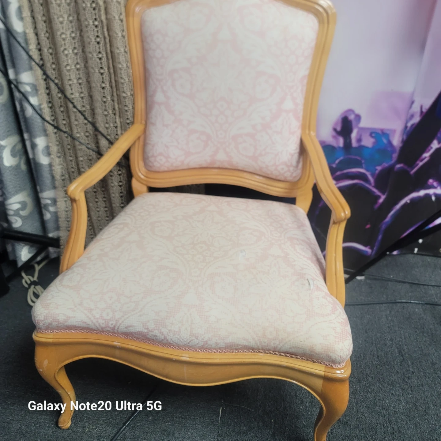 Selling a vintage armchair with a light pink patterned fabric. It has a wooden frame and a classic design. It's perfect for adding a touch of elegance to any room