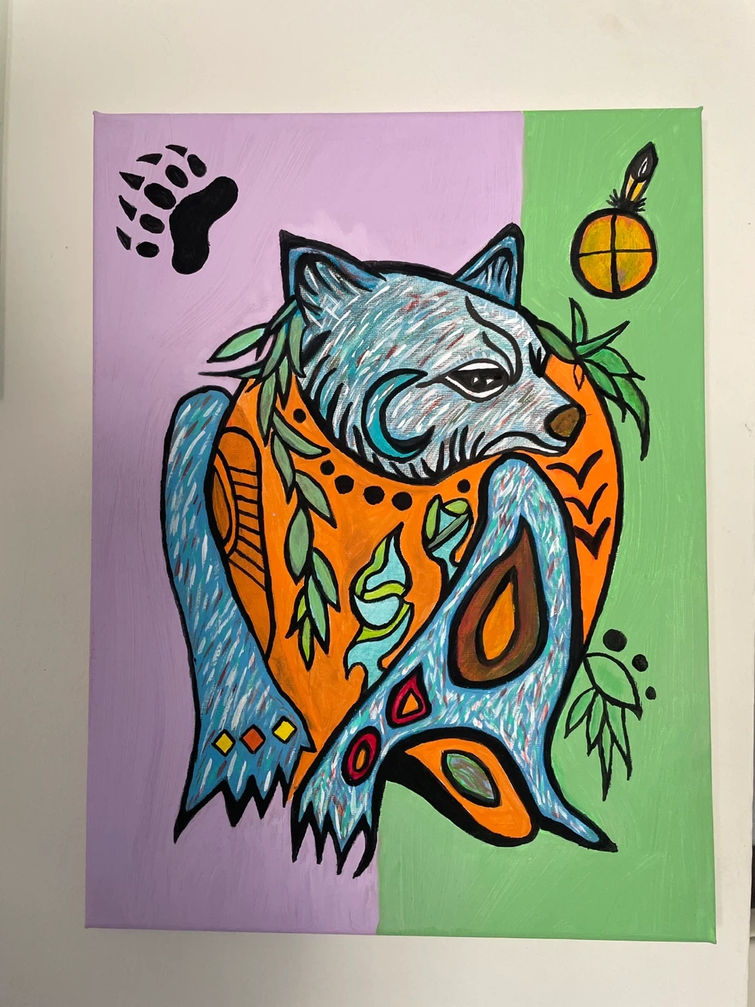 A vibrant canvas painting featuring a stylized wolf design with Indigenous art elements. The artwork showcases a unique colour palette and symbolic imagery, including a bear paw print and a feather. It's a striking piece that would complement any wall decor.