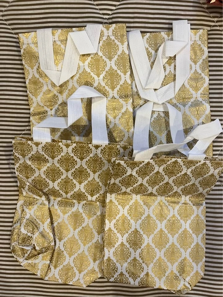 Set of non-woven fabric reusable gift bags with an elegant golden pattern. Sturdy and reusable. 5 bags available for $2 each.