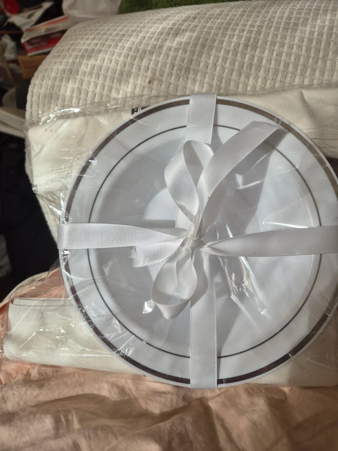 set of new white plate with a silver trim. It s still in the original packaging and tied with a ribbon.