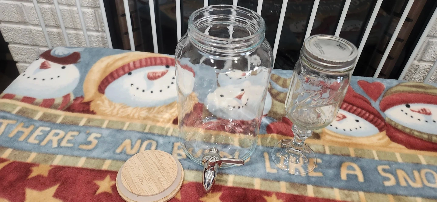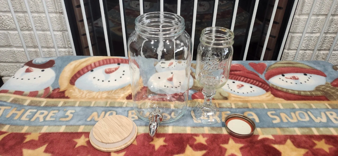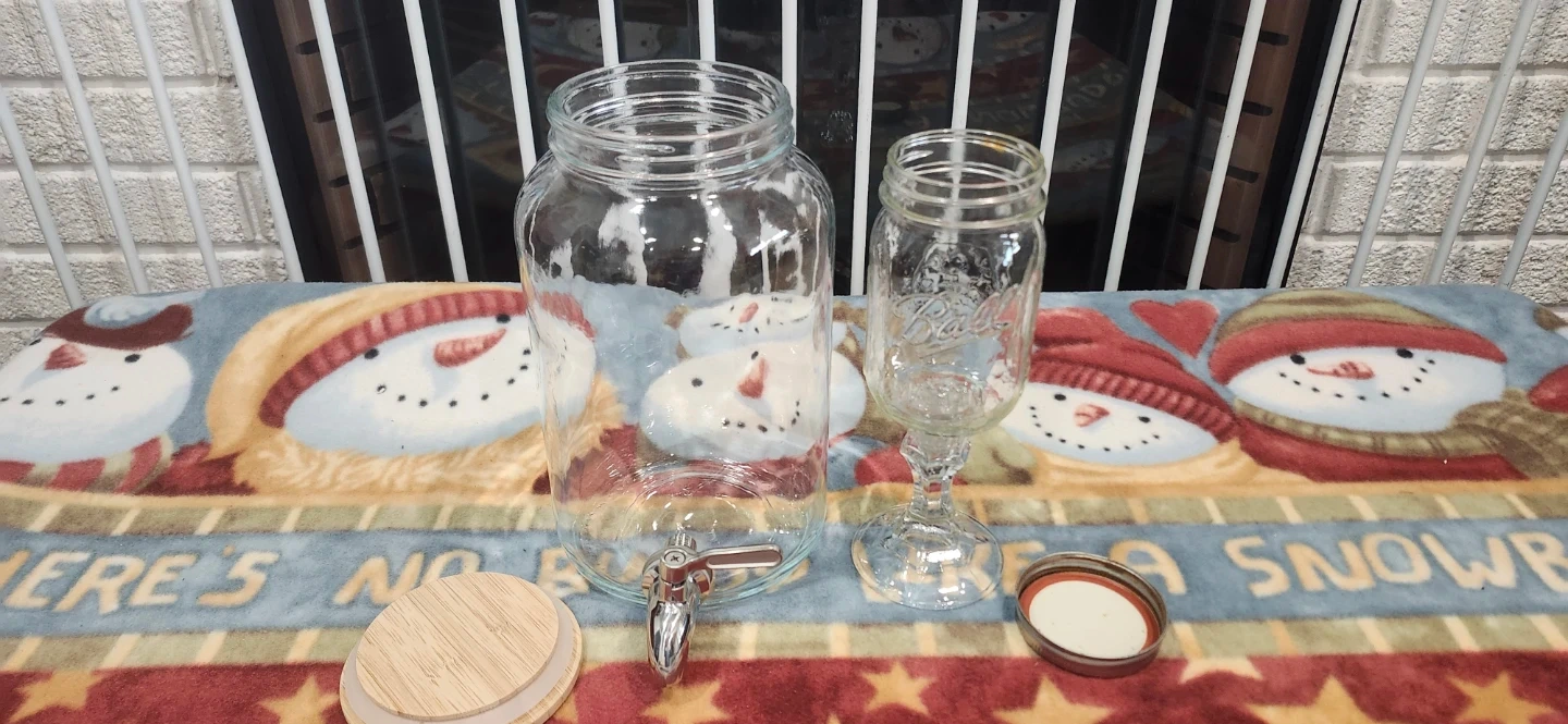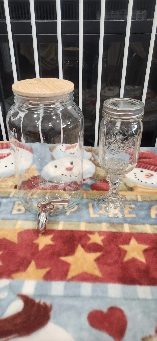 Selling a clear glass drink dispenser with a spigot and a separate mason jar glass. These are perfect for parties or everyday use. The dispenser has a wooden lid, and the mason jar glass has a metal lid.