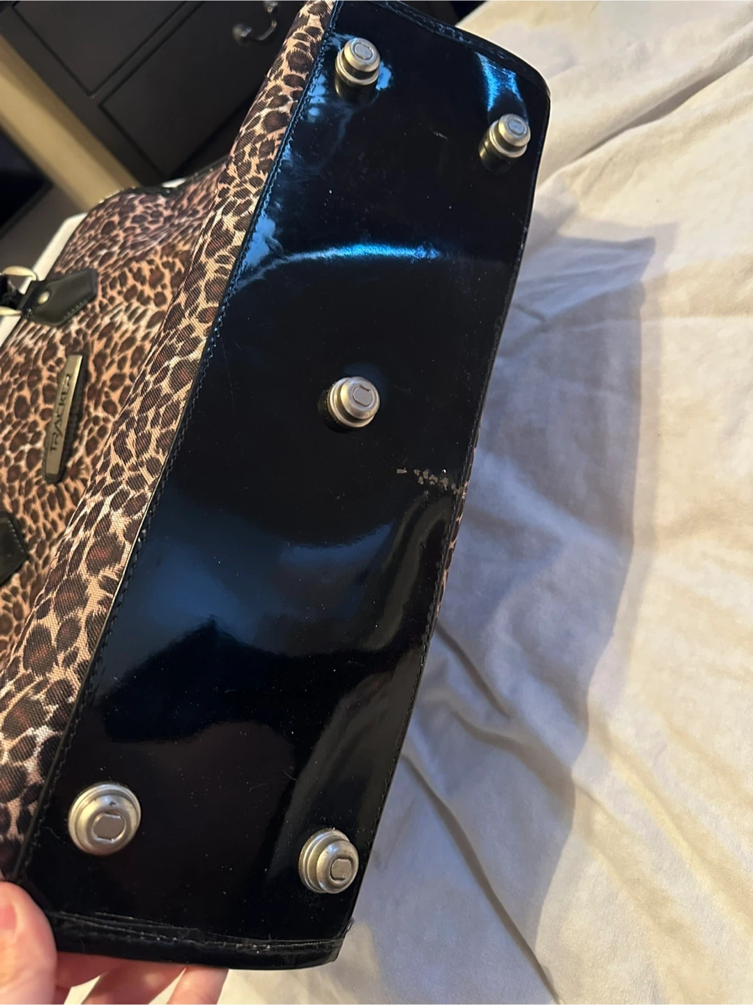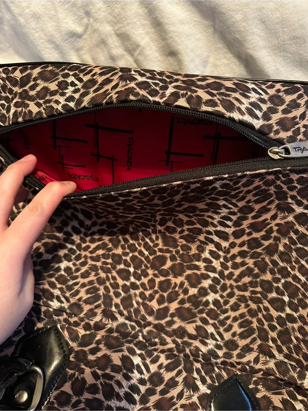 Never used Tracker bag in leopard print. It has a nice red interior and a ton of pockets. It’s actually crazy how many pockets this bag has lol