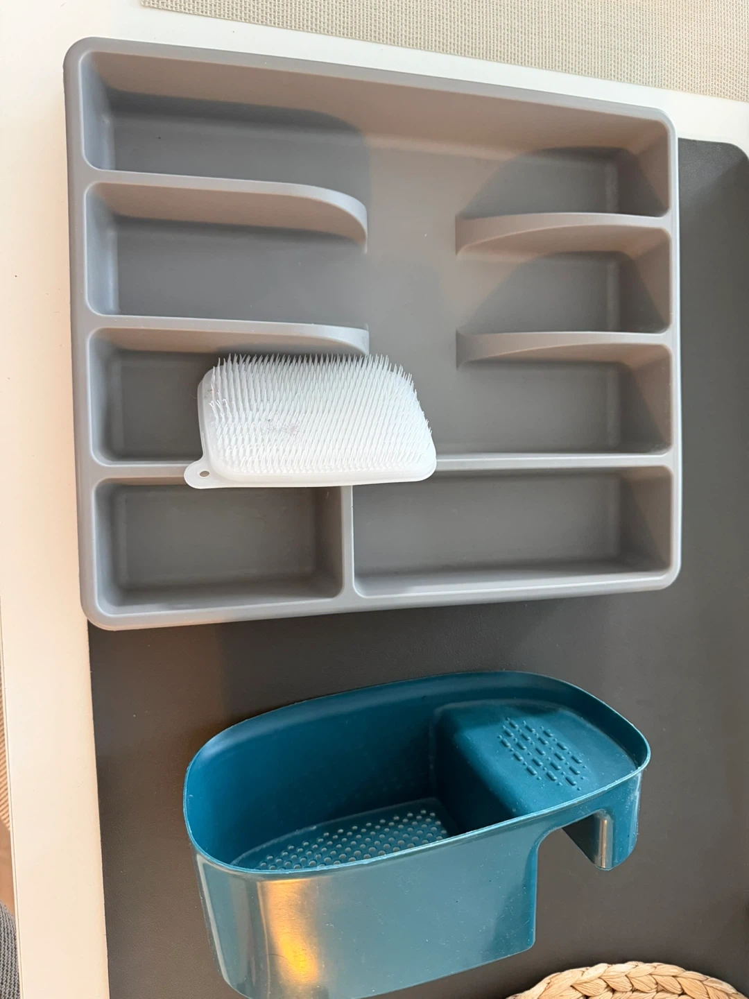 Declutter your drawers with this handy organizer set! Includes a grey cutlery tray, a white cleaning brush, and a teal storage container. Perfect for keeping everything tidy and accessible