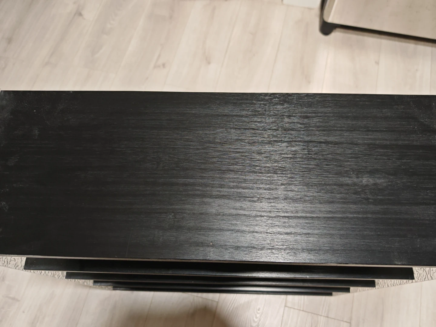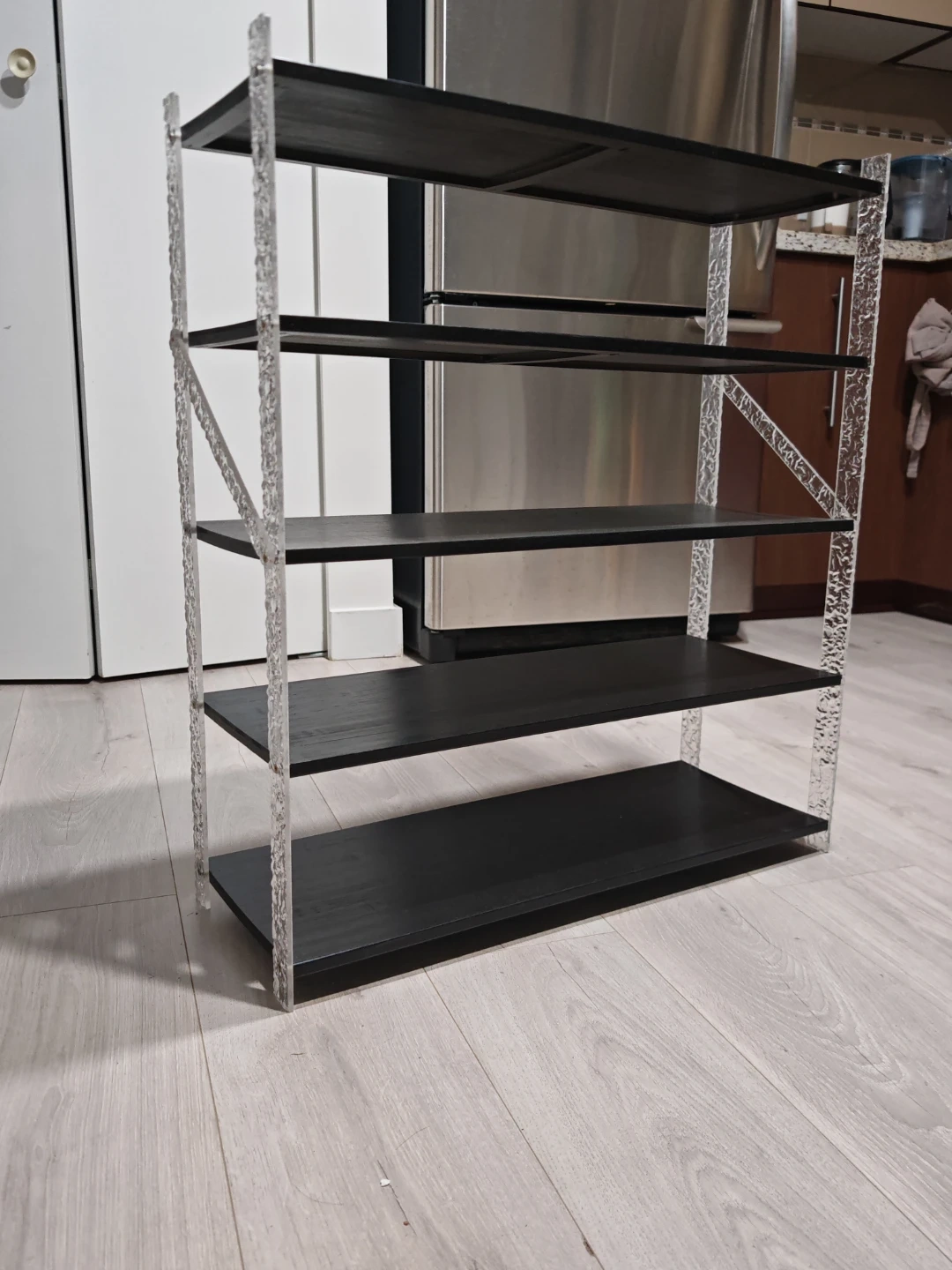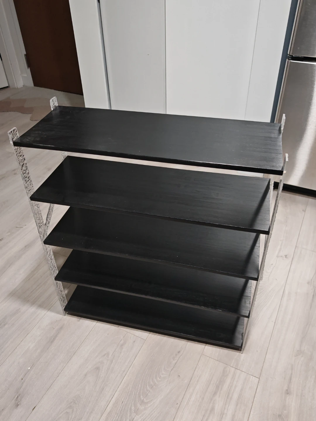 Selling a handy black 5-tier shelf! It's perfect for organizing shoes, plants, or anything you need to keep tidy. The shelf has a sleek look with clear patterned supports on either side.