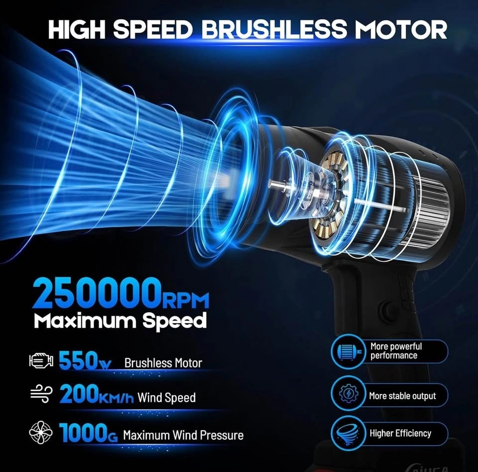 Powerful 550W brushless motor with up to 130 MPH (200 KM/H) air speed for clearing leaves, dust, grass, and debris.