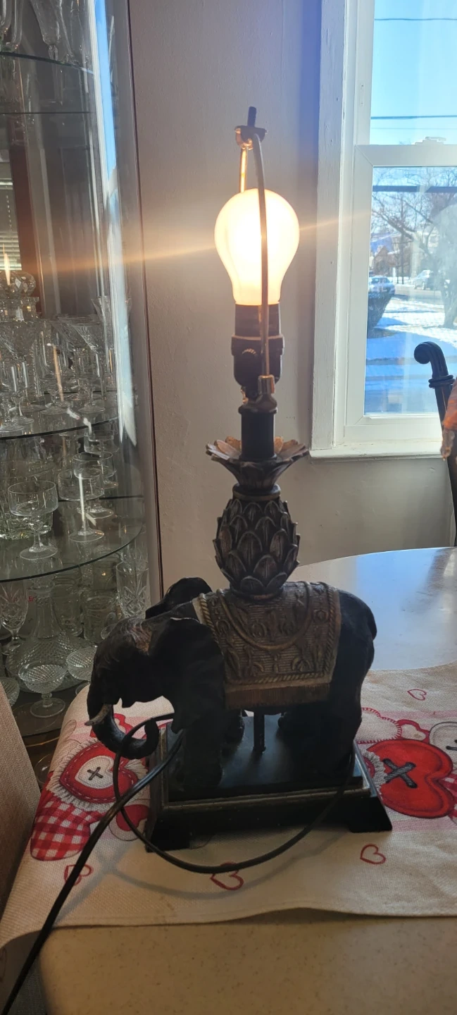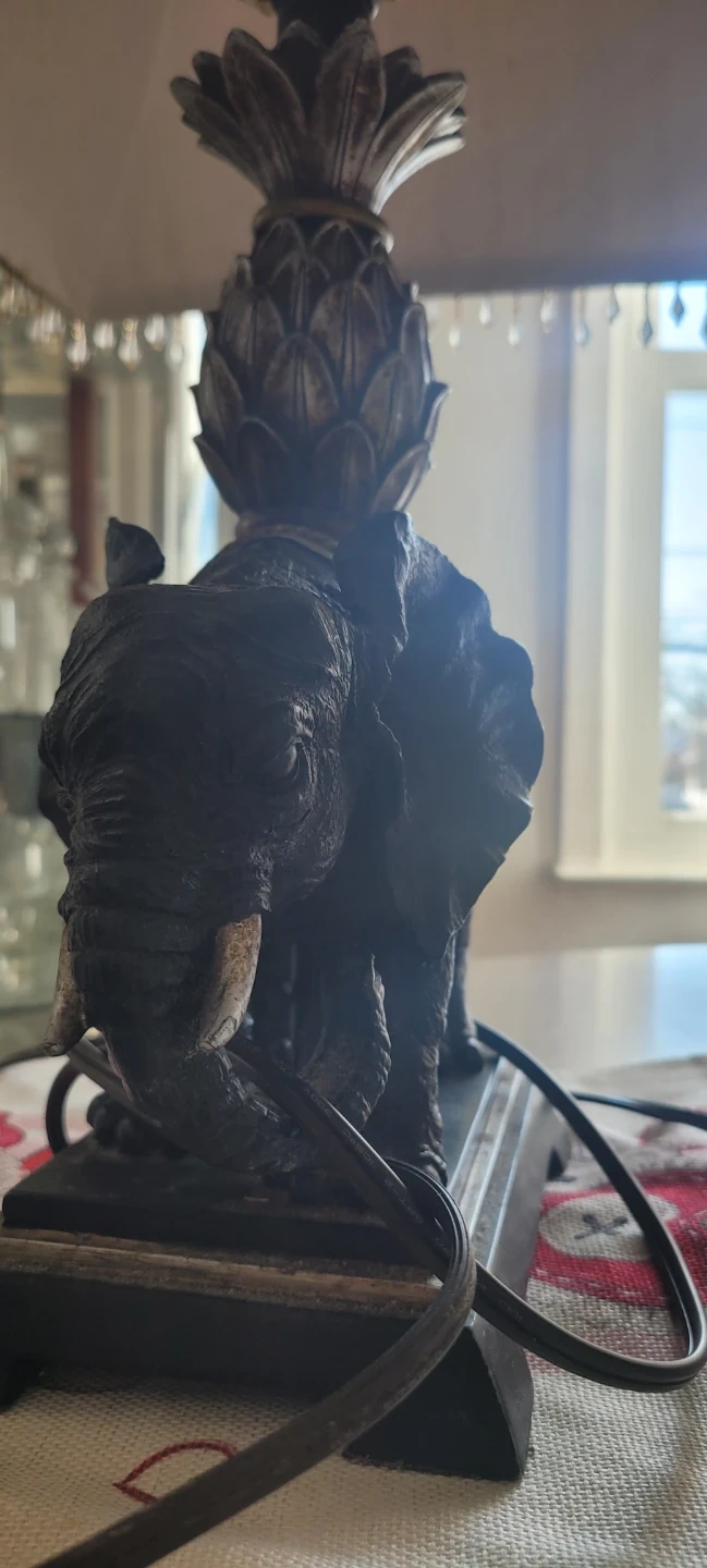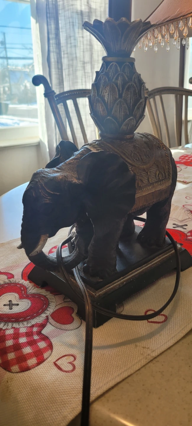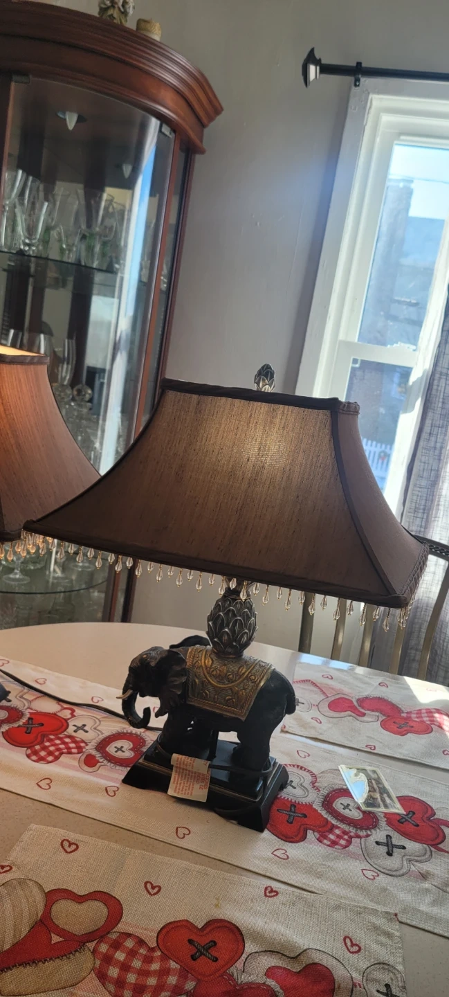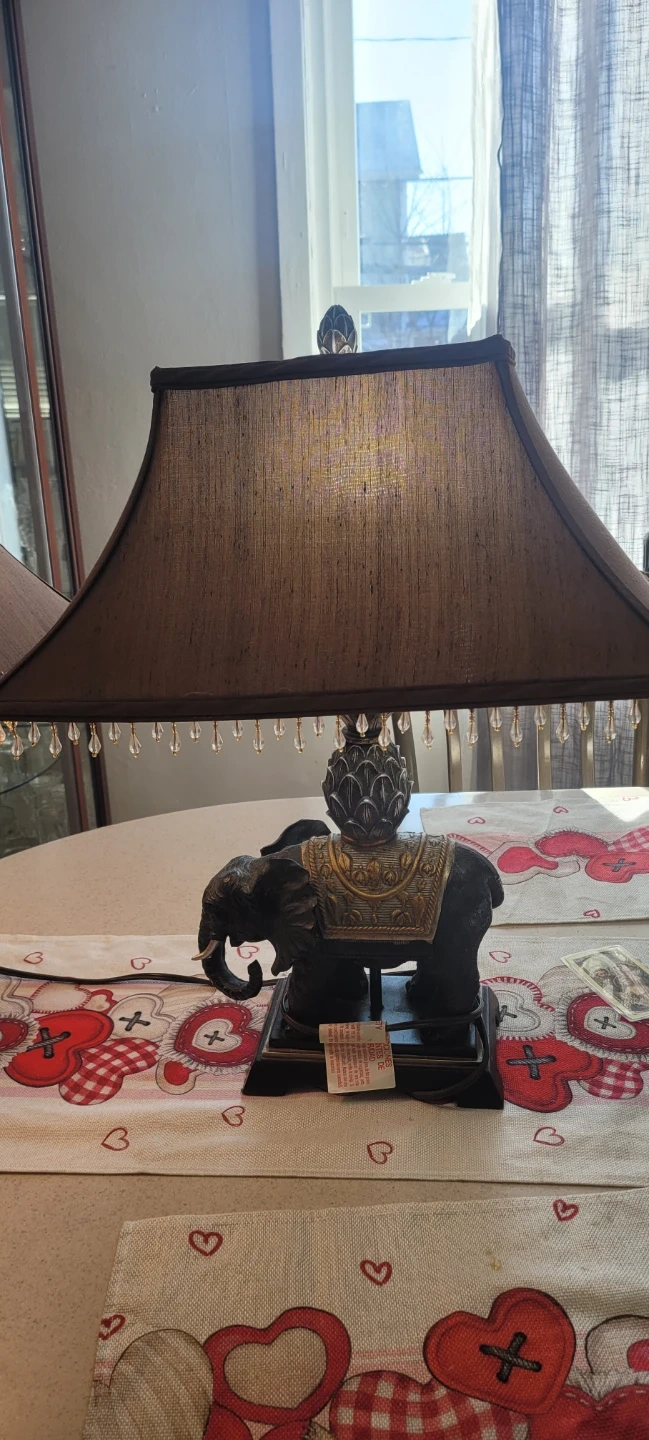 Selling an elephant table lamp with a brown shade. It features a decorative elephant base and a beaded trim on the shade. A lovely addition to any room!