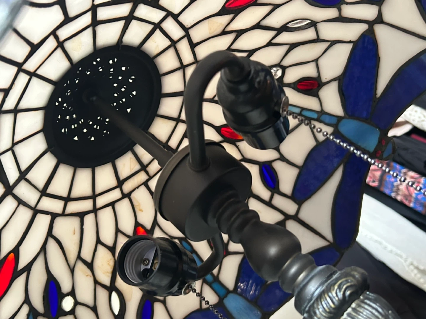 Beautiful Tiffany style table lamp featuring a dragonfly design. The base is dark metal and has a dragonfly pattern. The shade is made of stained glass in white, blue, and red tones. It will add a touch of elegance to any room!