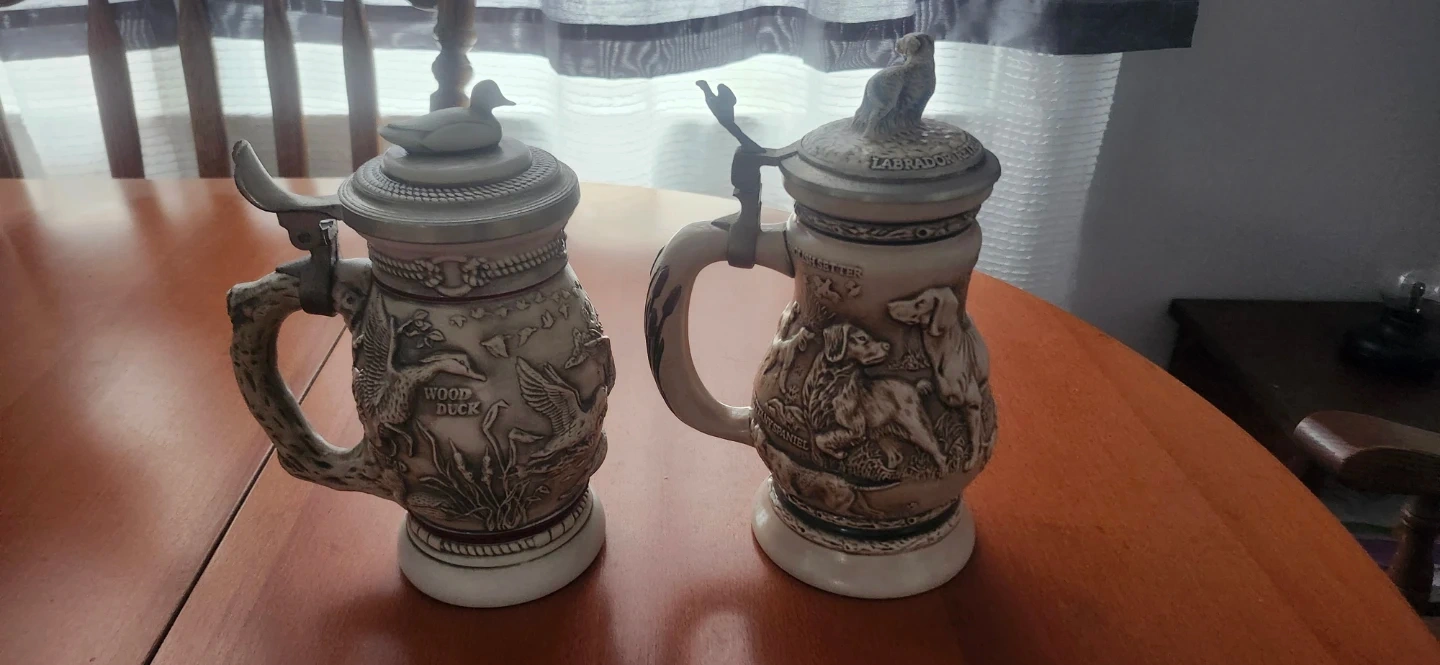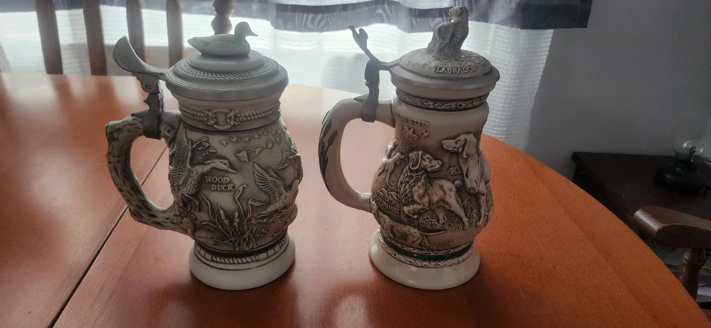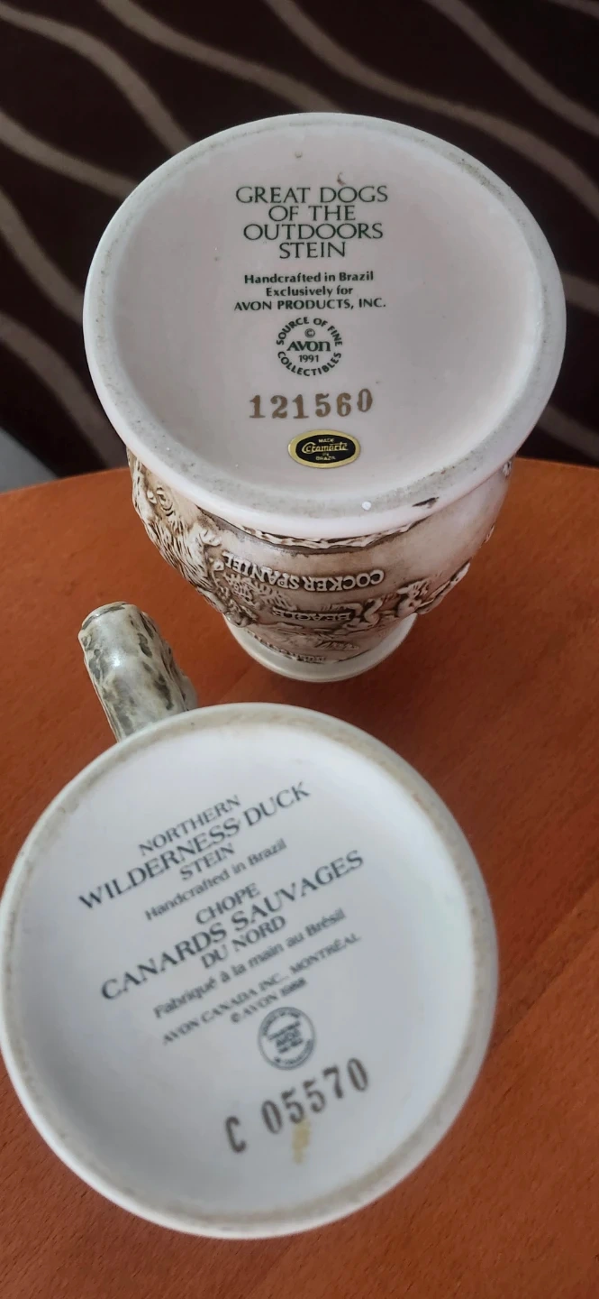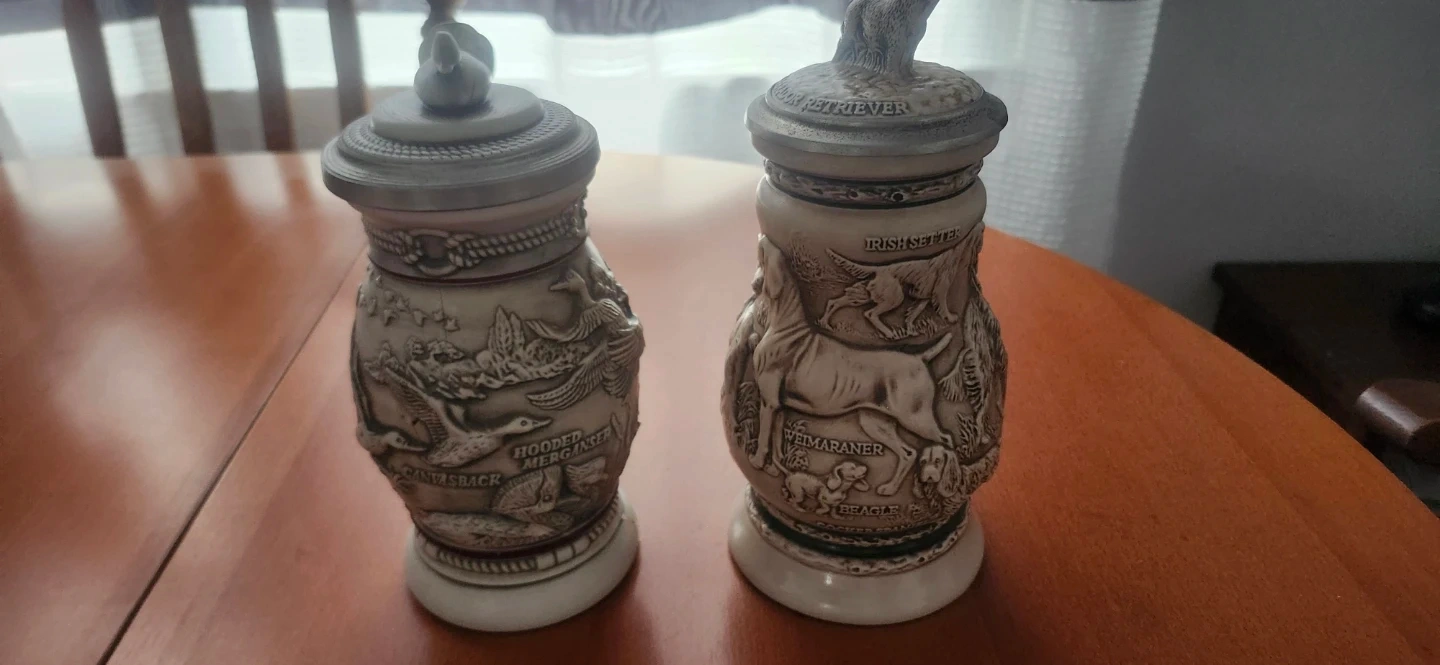 Selling two Avon Collectibles steins. One is from the "Great Dogs of the Outdoors" series, featuring various dog breeds. The other is the "Northern Wilderness Duck" stein. Both are in great shape and would make a lovely addition to any collection!